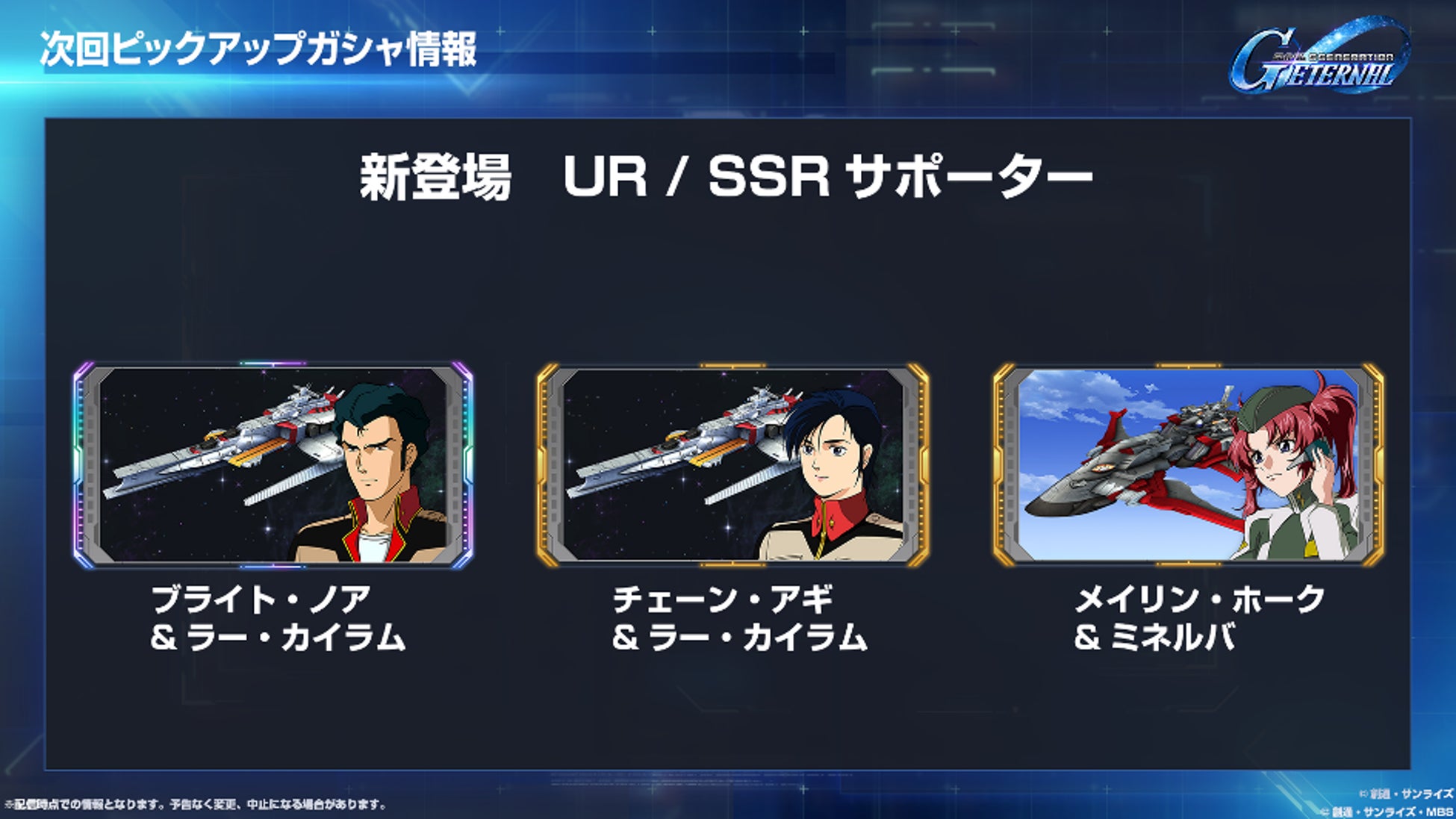 6月30日から開催予定のピックアップガシャには期間限定ユニットとしてUR「Hi-νガンダム(EX)」/UR「アムロ・レイ」、期間限定サポーターとしてUR「ブライト・ノア&ラー・カイラム」が登場予定です。また、UR「フォースインパルスガンダム(EX)」 /UR「シン・アスカ」のほか、SSRユニット、サポーターも多数追加予定です!