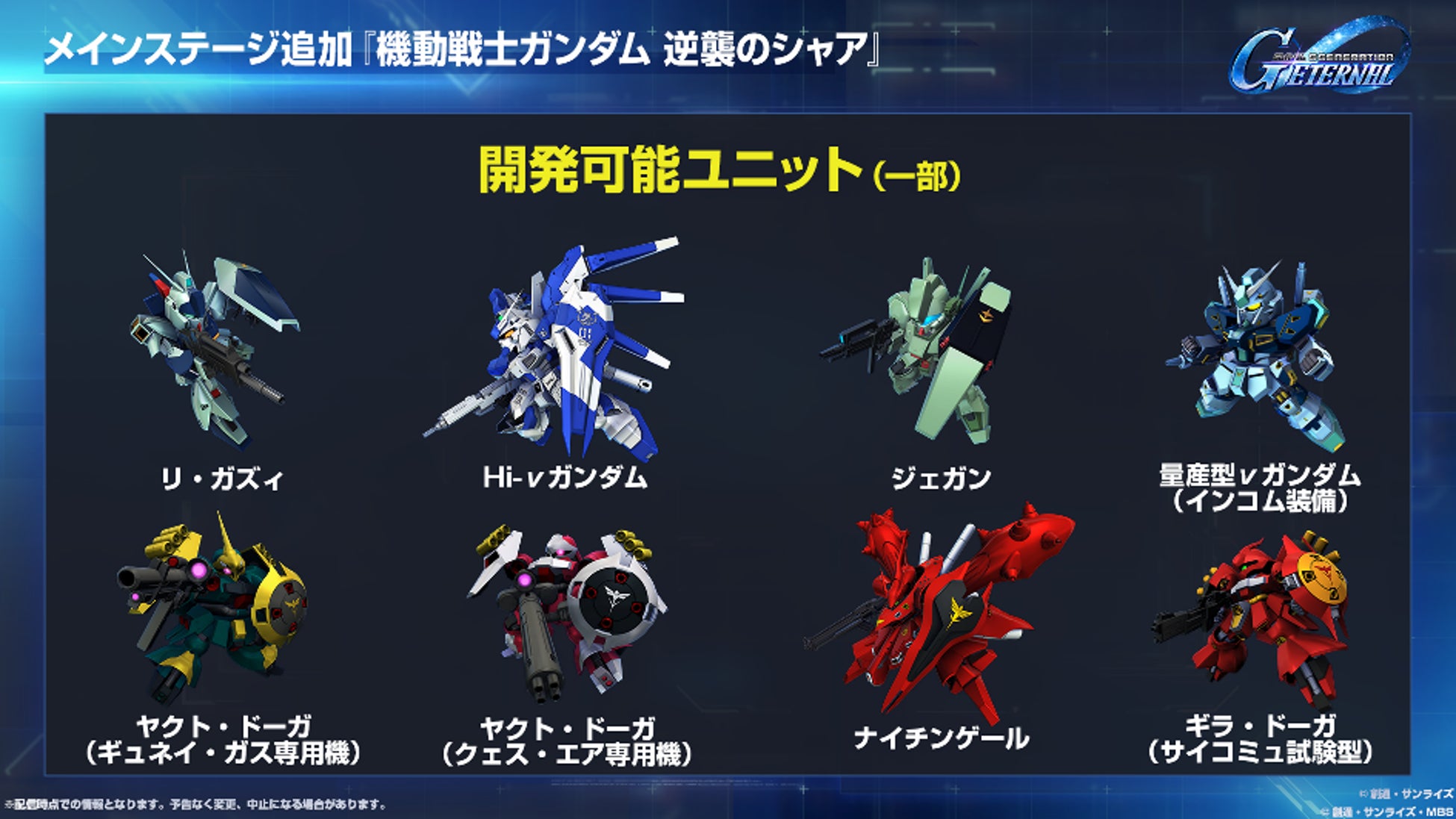 メインステージの追加に伴い、「機動戦士ガンダムSEED DESTINY」、「機動戦士ガンダム 逆襲のシャア」にちなんだ機体がゲーム内で登場!