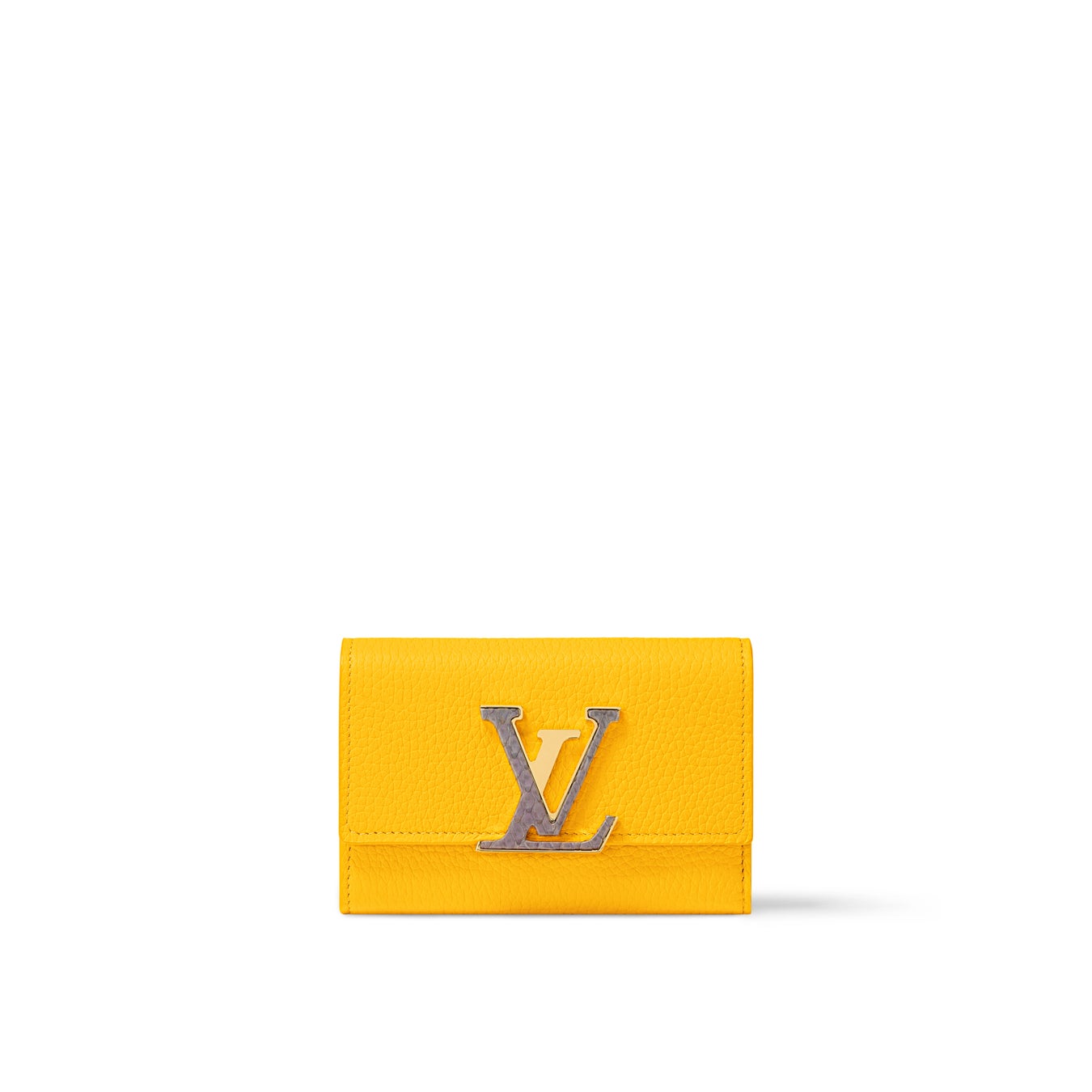 鮮やかなギンコイエローの色合いでアップデートされた「ポルトフォイユ·カプシーヌ コンパクト」。トリヨン·レザーで仕上げたプレイフルなアイテムに、パイソンレザーのトリミングを施したゴールドカラーのアイコニックなLV イニシャルを配しました。クレジットカードやコイン、紙幣を収納できる充分なスペースを備えたポケットサイズのデザインです。