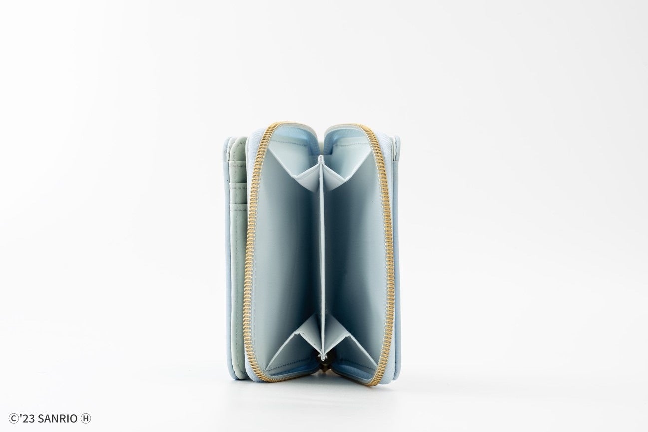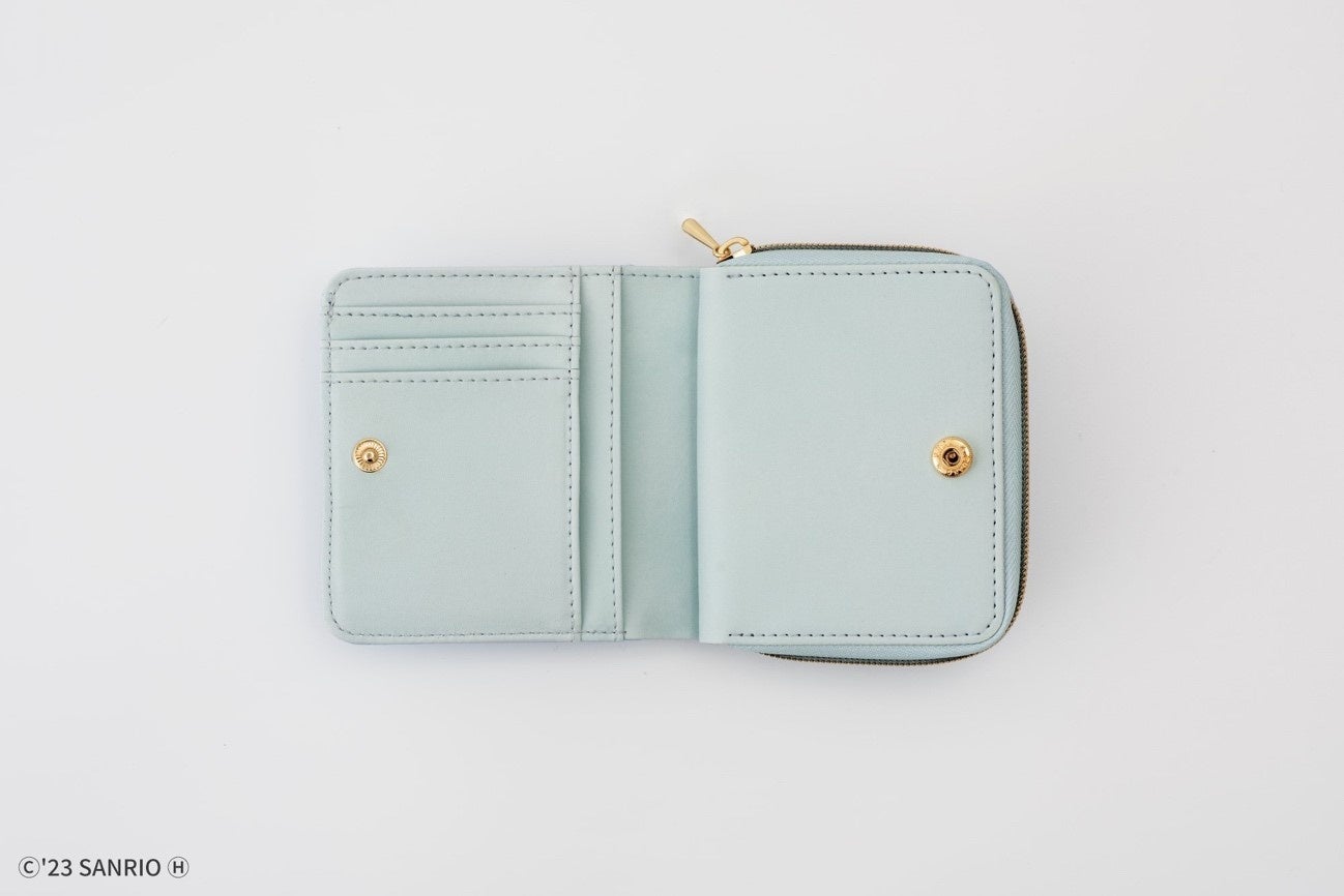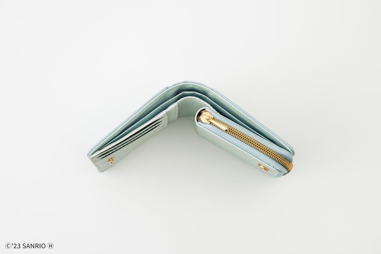遠いお空の雲の上で生まれたシナモロールにふさわしい、水色ボディの二つ折り財布。お星様を持ったかわいいシナモロールをプリントしました。ファスナーなどのパーツに合わせてゴールドであしらった箔押しのネームもポイントです。