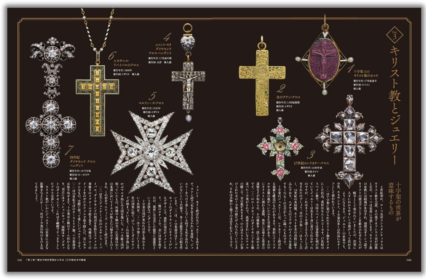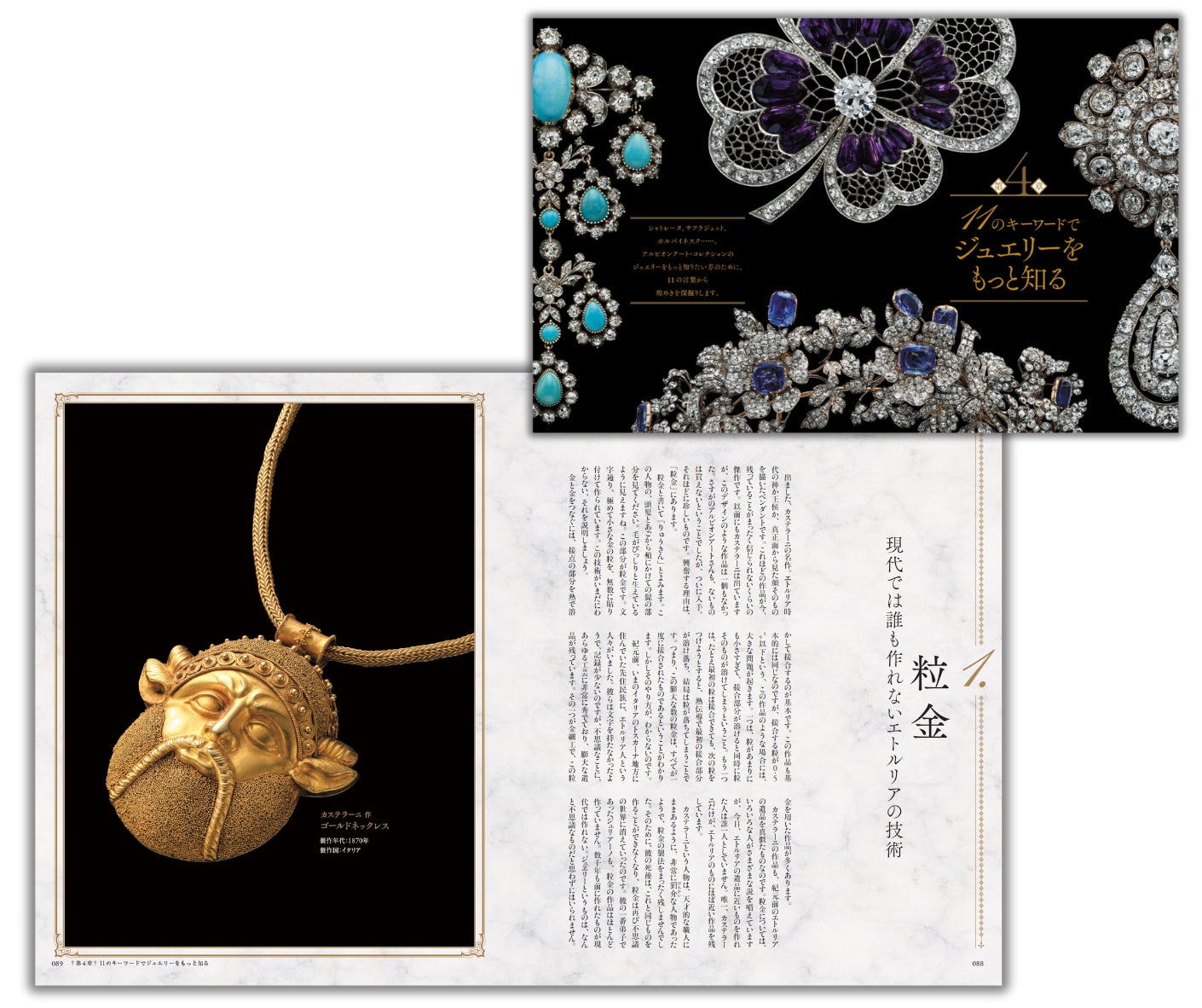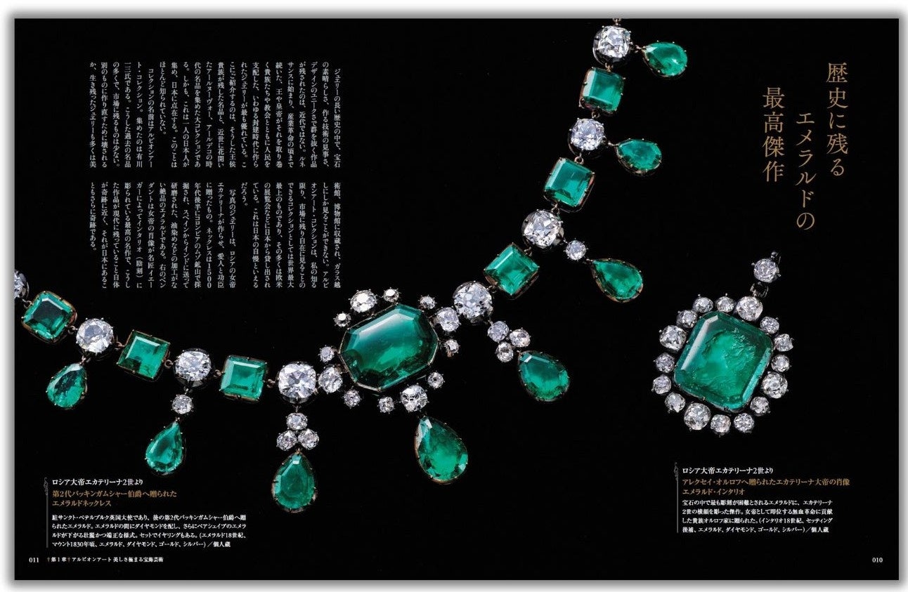 各ページでは「宝石の極み」ともいうべき名作中の名作を掲載、ジュエリーに纏わる歴史やストーリーとともに紹介しています。現代では再現不可能とも言える高度な技術によって作られたジュエリーが、現代に残っているという奇跡にも驚かされます。