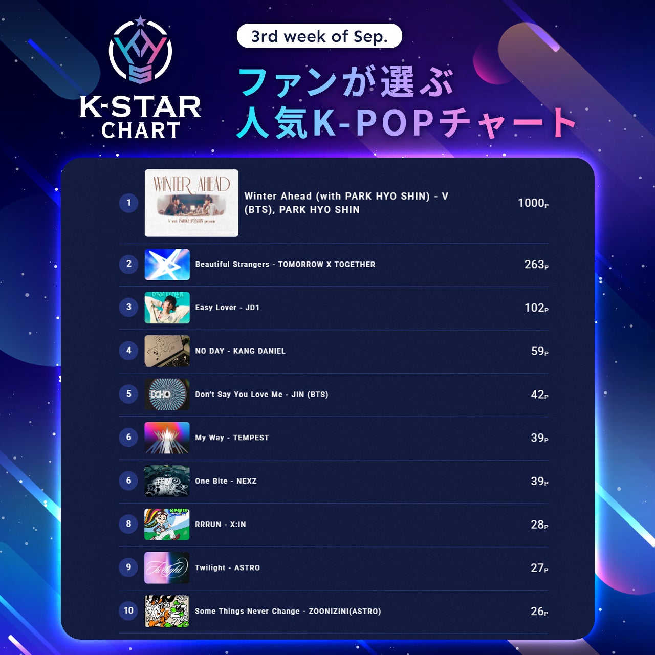 『K-STAR CHART presents POP-K TOP10 Friday』週間チャート1位は、BTSのVとパク・ヒョシンによる「Winter Ahead (with PARK HYO SHIN)」となり、番組内でもオンエアされました。