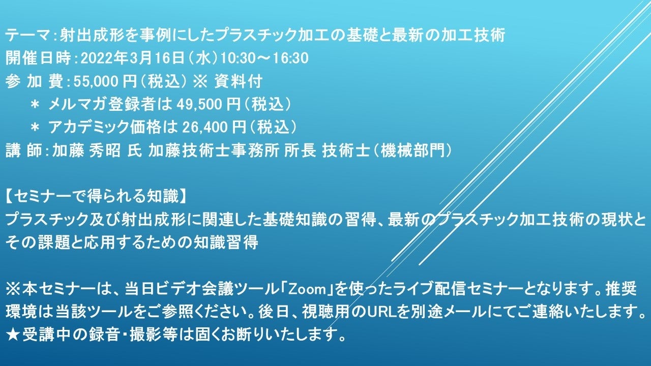 【ライブ配信セミナー】射出成形を事例にしたプラスチック加工の基礎と最新の加工技術 3月16日(水)開催 主催:(株)シーエムシー・リサーチ