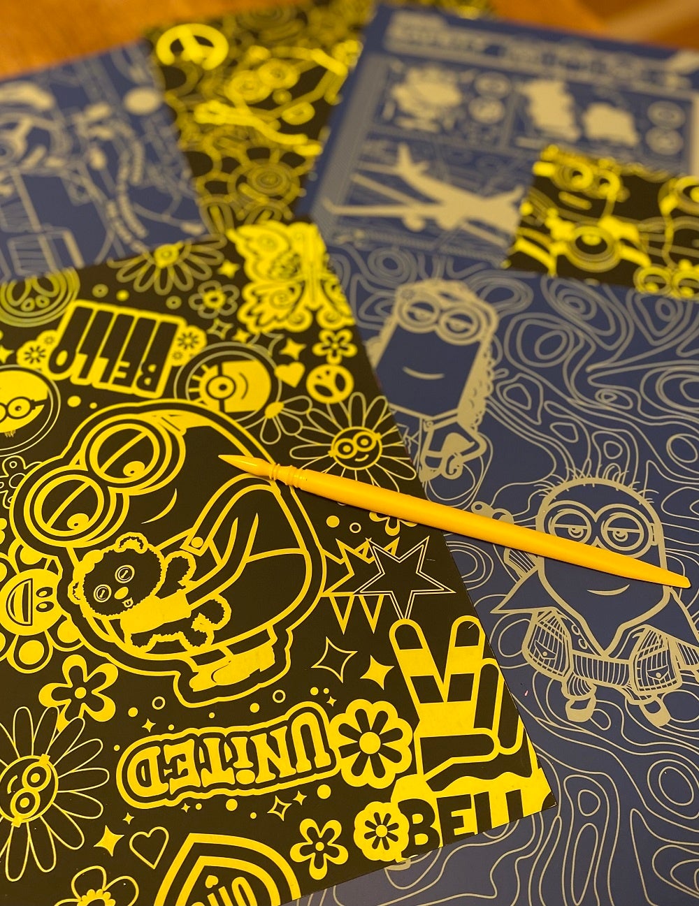ミニオンのスクラッチアートは、シート6枚、専用ペン付き。キラキラ光るホログラム3枚とカラフルなレインボーカラー3枚入り。
