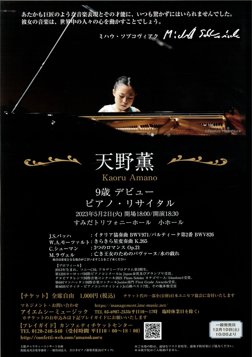 9歳のピアニスト・天野薫デビューリサイタル開催決定!カンフェティにてチケット一般発売開始
