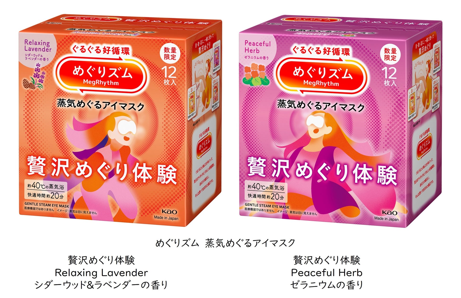 「蒸気めぐるアイマスク」は、秋冬らしいラベンダーとウッディーなアロマを使った上質で落ち着きのある「シダーウッド&ラベンダーの香り」と、ゼラニウムとハーブを使った軽やかで心地よい「ゼラニウムの香り」の2種を揃えました。