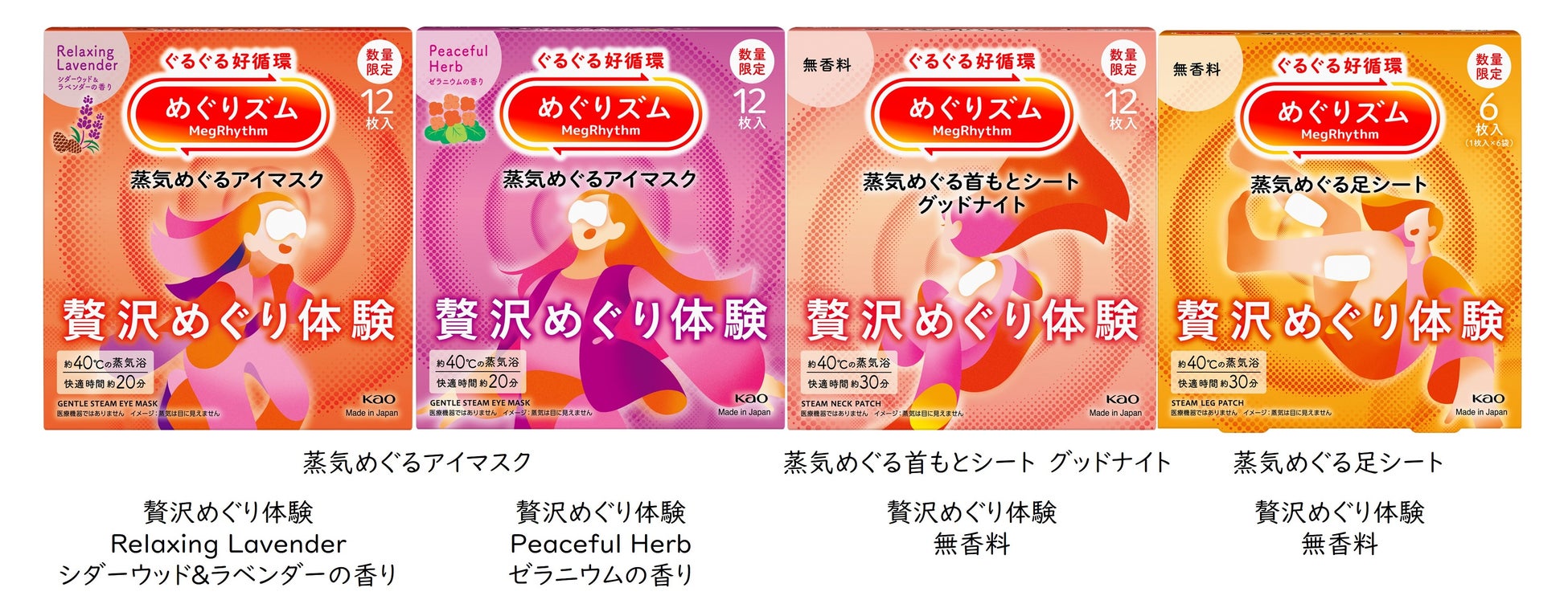 「めぐりズム 贅沢めぐり体験」シリーズは、これからの季節にぴったりな2種の香りのアイマスクと、首もとシート、足シートを組み合わせた4商品。目・首・足に一緒に使うことで、気分までときほぐれて、全身に心地よさめぐるひとときを提供します。