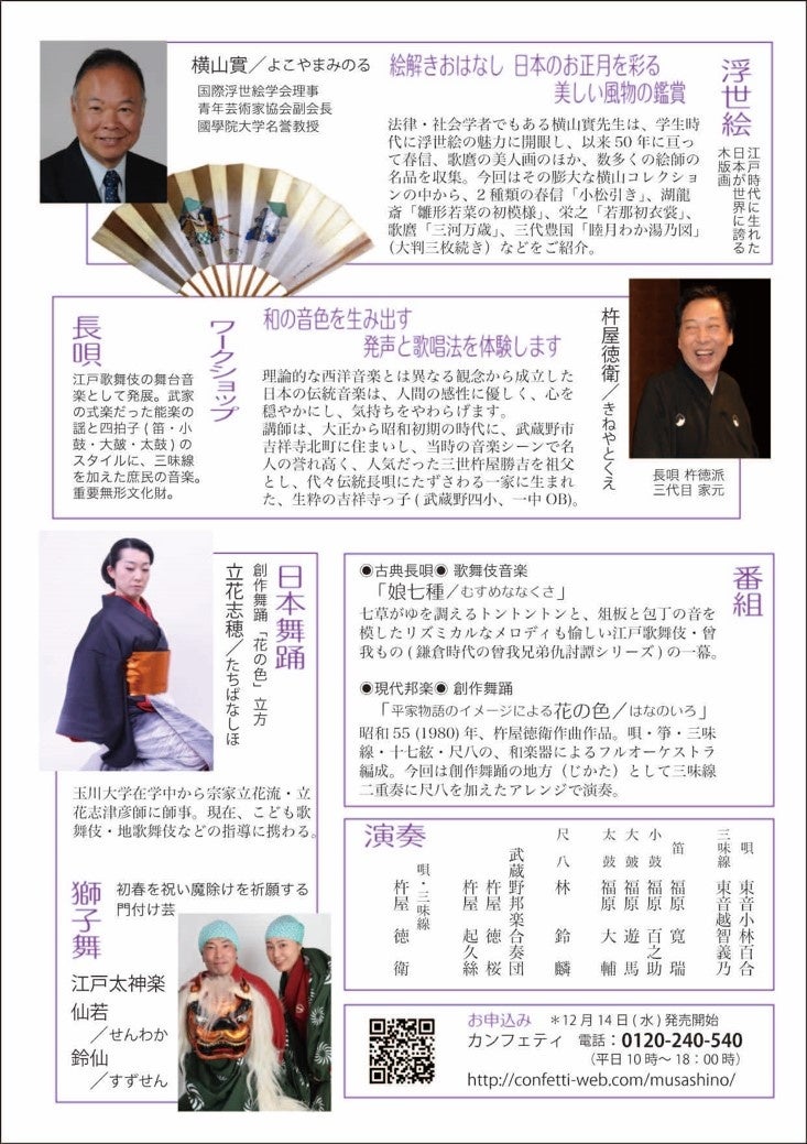 武蔵野邦楽合奏団主催、『浮世絵とたのしむ和の音色・舞踊』が2023年1月14日(土)に武蔵野芸能劇場(東京都武蔵野市中町1丁目15-10)にて開催されます。