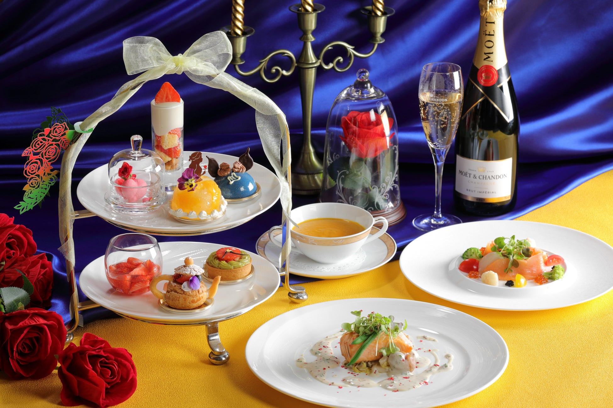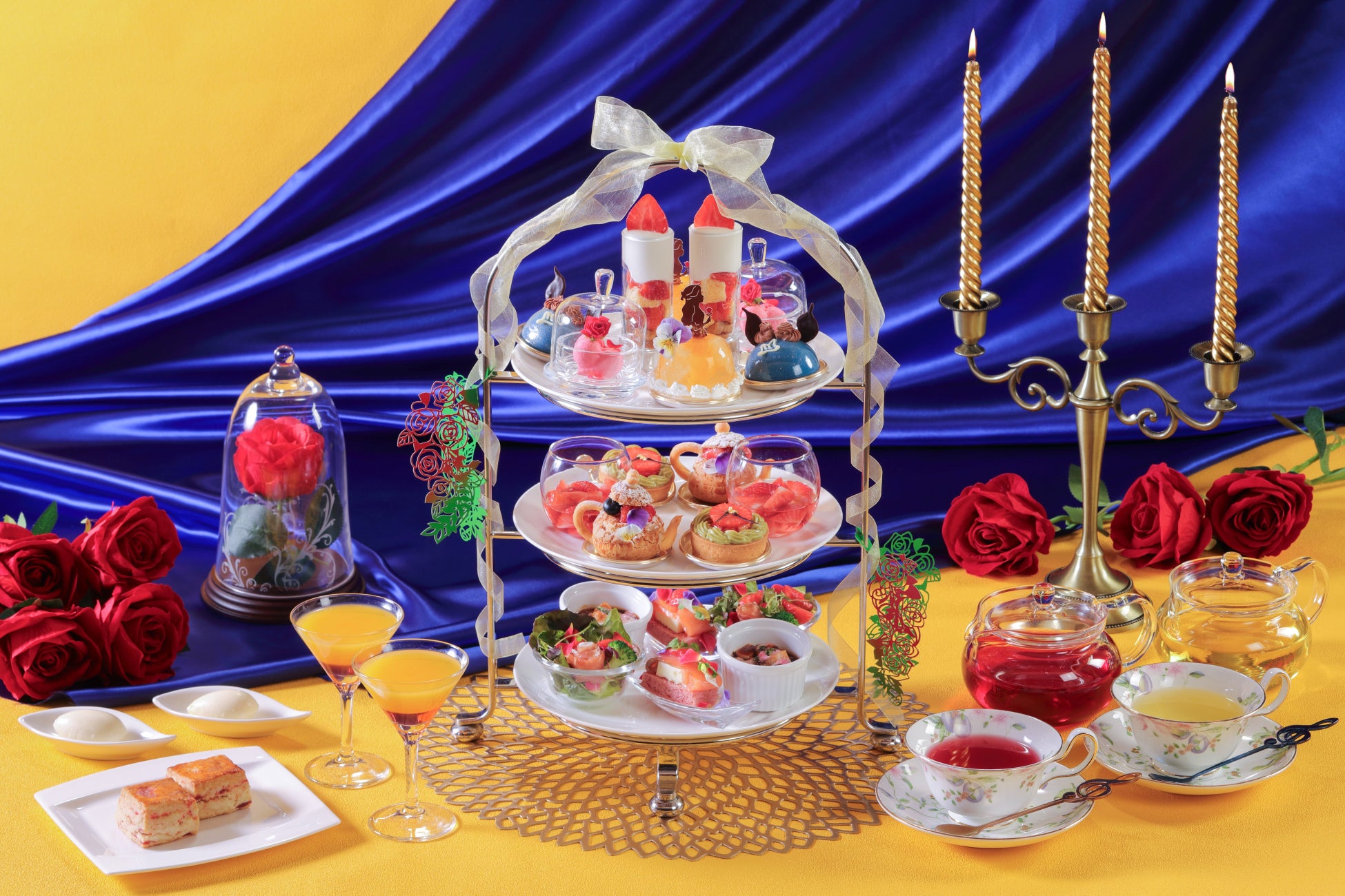 美女と野獣、ティーポット、キャンドル、時計などをモチーフにしたスイーツでティースタンドを飾り、「美女と野獣」の世界観を表現したアフタヌーンティー。旬のいちごをふんだんに使用し、物語のキーアイテムである“バラ”を散りばめた色鮮やかなスイーツとセイボリーをお楽しみいただけます。