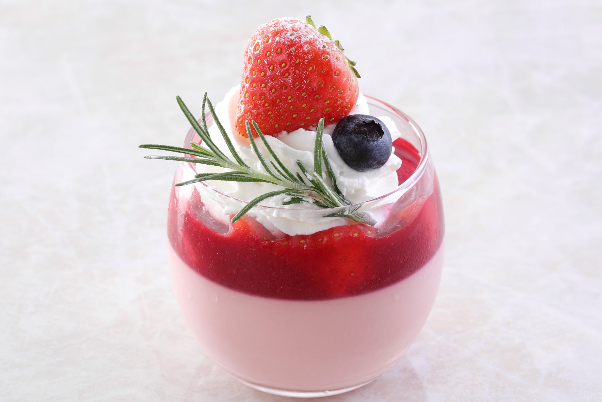 甘酸っぱいいちごとミルクのコクを味わえる、なめらかな食感のいちごプリンに、いちごの果肉感を楽しめる濃厚ないちごソースを流し、生クリームやいちごなどをトッピングしました。
