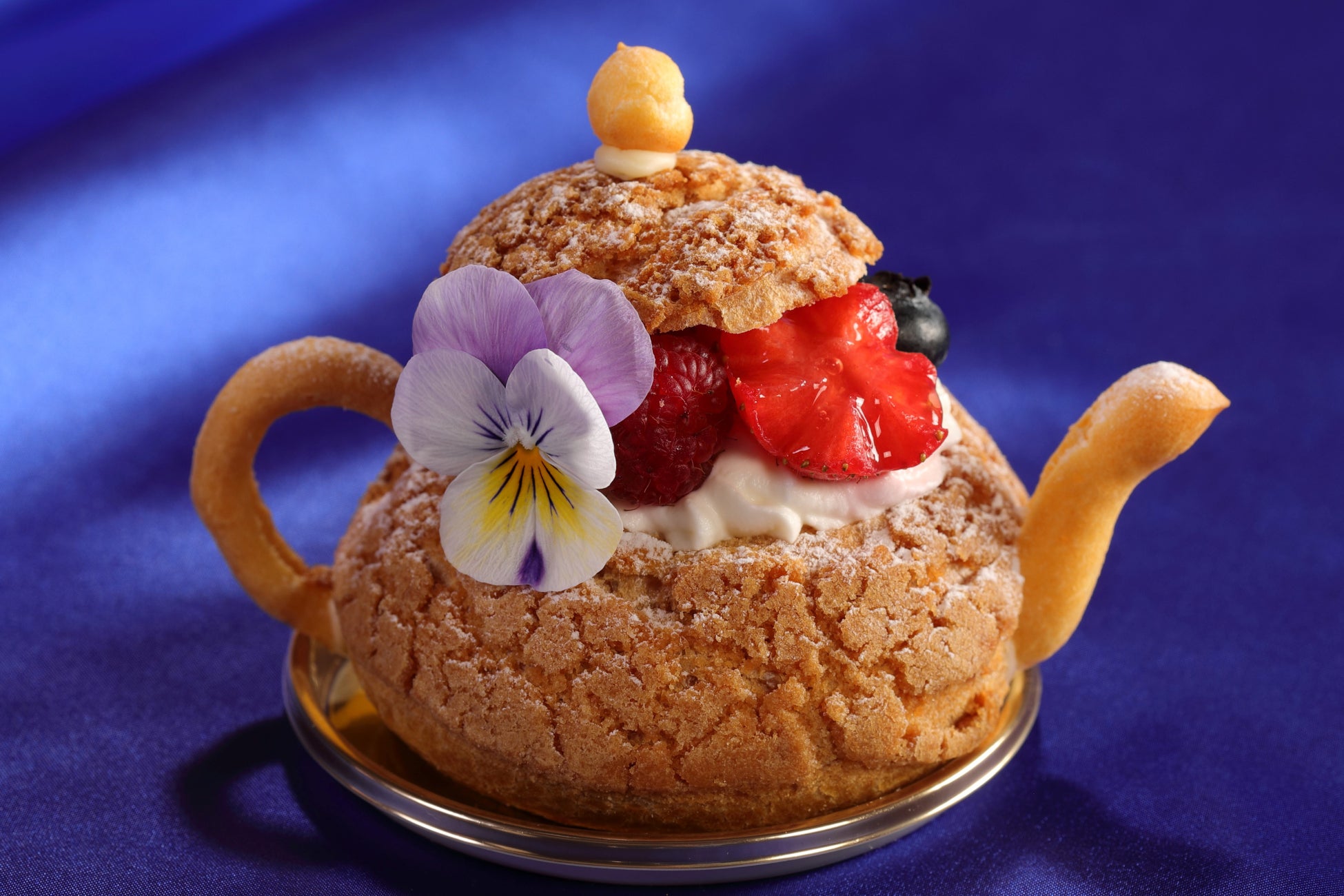 ティーポットの形をしたオシャレでフォトジェニックなシュークリーム。ビスケット生地をのせて焼き上げたシュー生地に、いちごクリーム、いちごジャム、生クリームを詰め、いちごやエディブルフラワーを飾りました。