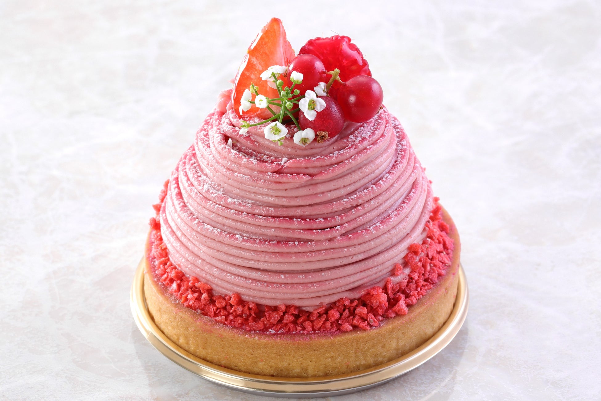 アーモンドクリームのタルト生地に、コクのあるチーズクリーム、いちごクリームを絞り、モンブラン風に仕上げました。甘酸っぱいいちごとチーズのさわやかな酸味が楽しめる、可憐なピンク色のモンブランです。