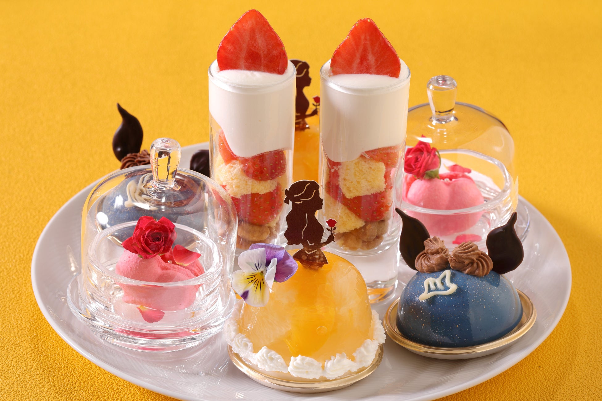 カフェ&グルメショップ カフェベルでは、「美女と野獣」のスイーツをご自宅でもお楽しみいただけるよう、アフタヌーンティーのアイテムをアレンジしたスイーツを3種類販売します。その他、いちごタルトやいちごとクリームチーズのマフィンなど、いちごを存分に楽しめるスイーツおよびパン各種も販売します。甘酸っぱくてジューシーないちごを、スイーツやカクテルなどさまざまなスタイルでお楽しみください。