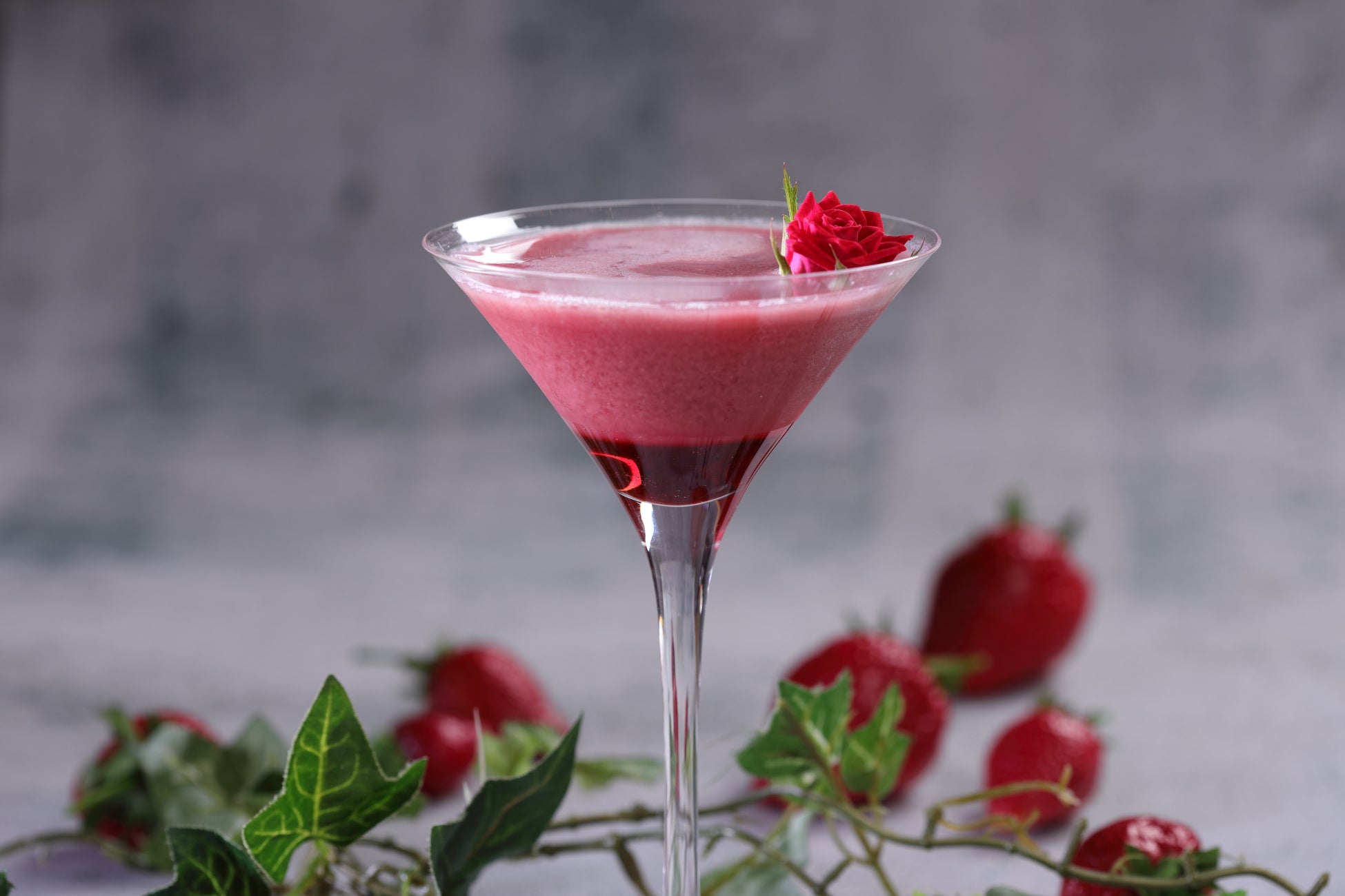 甘酸っぱいいちごにミルキーなホワイトチョコがバランスよく調和した、見た目も華やかなデザートカクテル。ストロベリーリキュールとホワイトチョコリキュールをベースに、赤ワインとカシスを合わせ、鮮やかなピンク色に仕上げました。