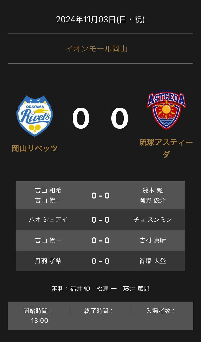 ノジマTリーグ 2024-2025シーズン 公式戦 11月3日開催 岡山リベッツ vs 琉球アスティーダ 対戦オーダー発表