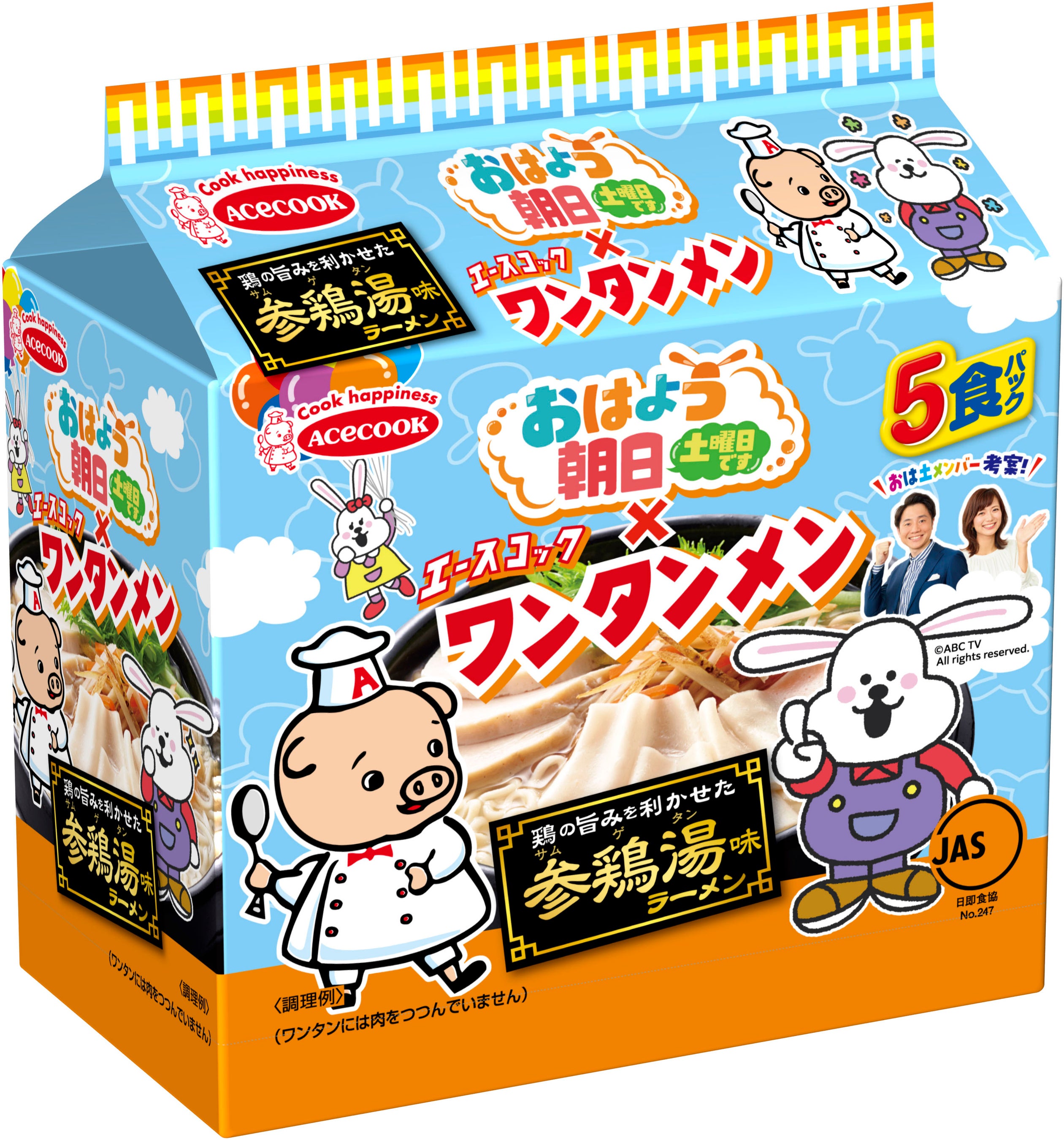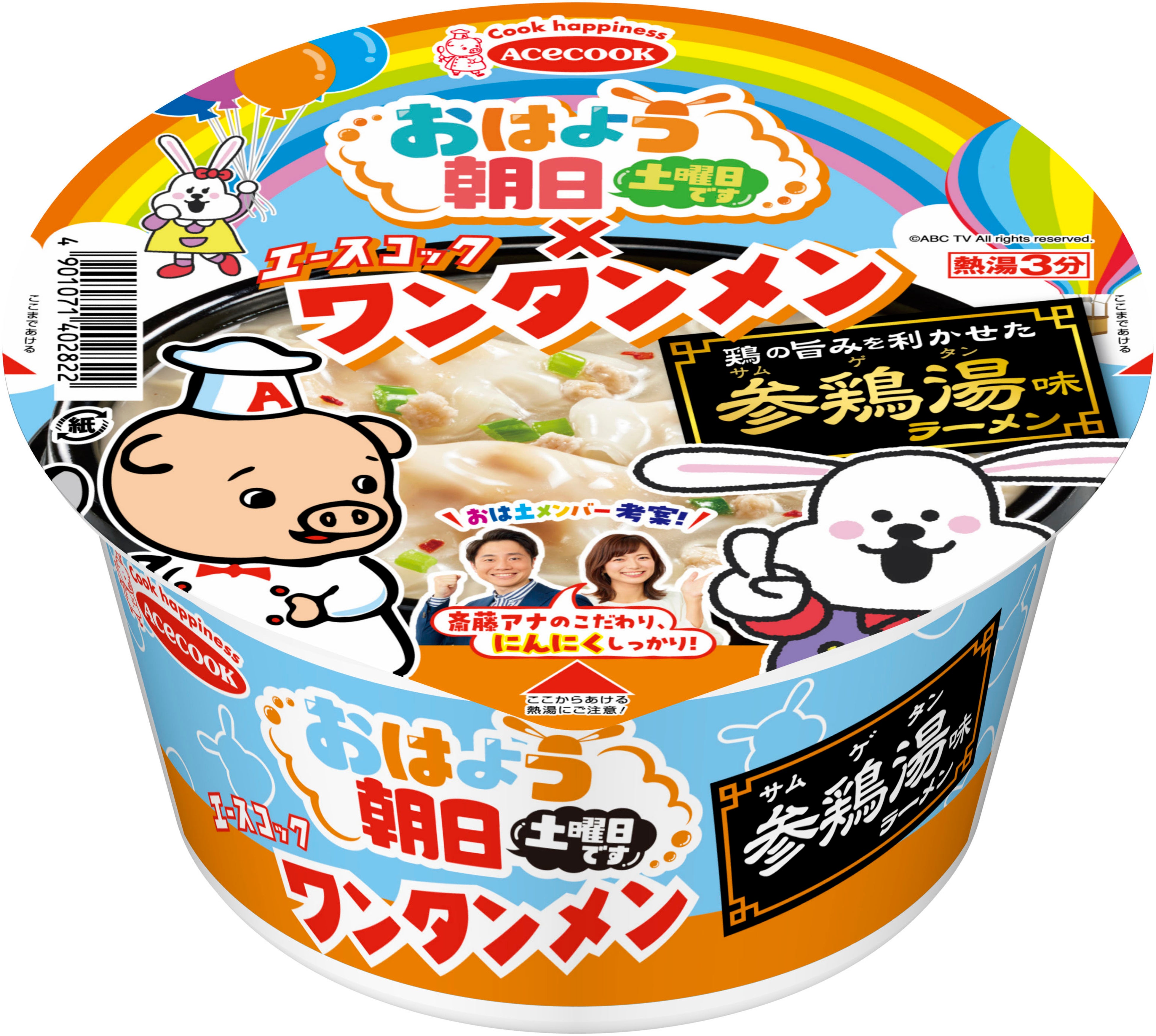 ABCテレビの朝の情報番組「おはよう朝日 土曜日です」と2023年に発売60周年を迎える「ワンタンメン」がコラボした新商品を共同開発しました。「おは土」メンバーが日々のリサーチで最新のトレンドをキャッチ。韓国ブームで注目を集める参鶏湯の味わいに、つるっとした食感のワンタンを合わせました。鶏の旨みが利いたスープをベースに、袋めんでは、参鶏湯特有の米の香り、とろみを再現し、どんぶりでは、にんにくをガツンと利かせた味わいに仕上げました。