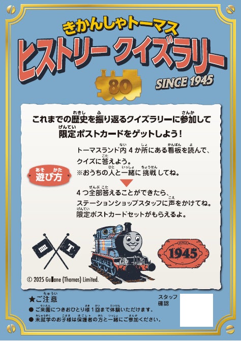 トーマスランド内4か所のラリーパネルを巡り、歴史を振り返るクイズに挑戦。全問正解した方にはポストカードセットをプレゼントします。