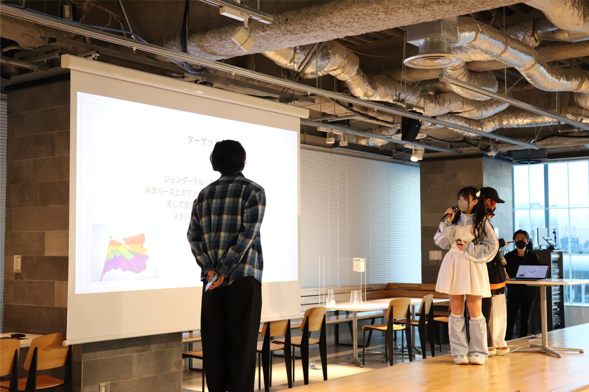 第二部のワークショップでは、バンタン生徒を3つのグループに分け、メタバースをテーマに「メタバース発のブランドをつくるなら」、「メタバースで新しいビジネス」、「メタバースでマーケティング」の3つのお題でグループ毎での検討とプレゼンテーションの準備を行いました。午後13:00から各グループに分かれ、午後16:00からグループ毎でのプレゼンテーションを行いました。最初のグループ「太極拳」のプレゼンテーションは、メタバースファッションとゲームコンテンツを掛け合わせしたアパレル「ABILLY」を発表。ゲームの世界の様に、能力が身に付くメタバースファッションをプレゼンテーションして頂きました。2つ目のグループ「Over turn」は、メタバースの世界だから実現できる自由なデザインや、物理的には表現のできない洋服を販売する企画。3つ目のグループ「GREEN」は、イベントに特化したメタバースファッションブランドをプレゼンテーションしていただきました。