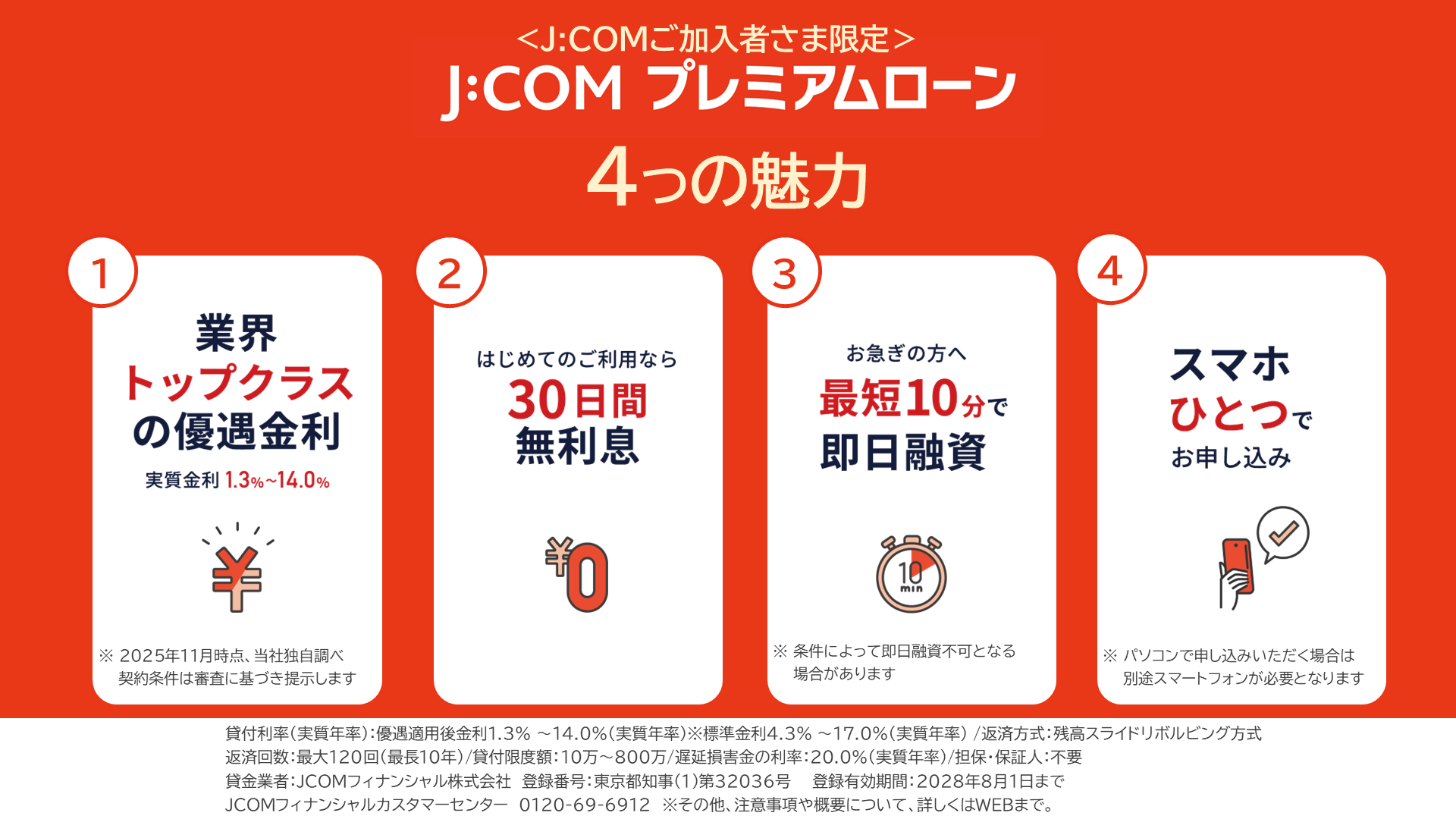 「J:COM プレミアムローン」は、J:COMご加入者さまが実質年率1.3%~14.0%※1で1万円からお借入れいただける個人向けローンサービスです。J:COMのスーパーアプリ「MY J:COM」またはWEBサイトで、お申し込みからご返済まですべて完結でき、申込完了から最短10分※2での借入が可能です。また、初めてのご利用の場合はお借入日の翌日から30日間、無利息が適用されます。さらに、「J:COM プレミアムローン 誕生キャンペーン」も実施します(詳細別紙)。