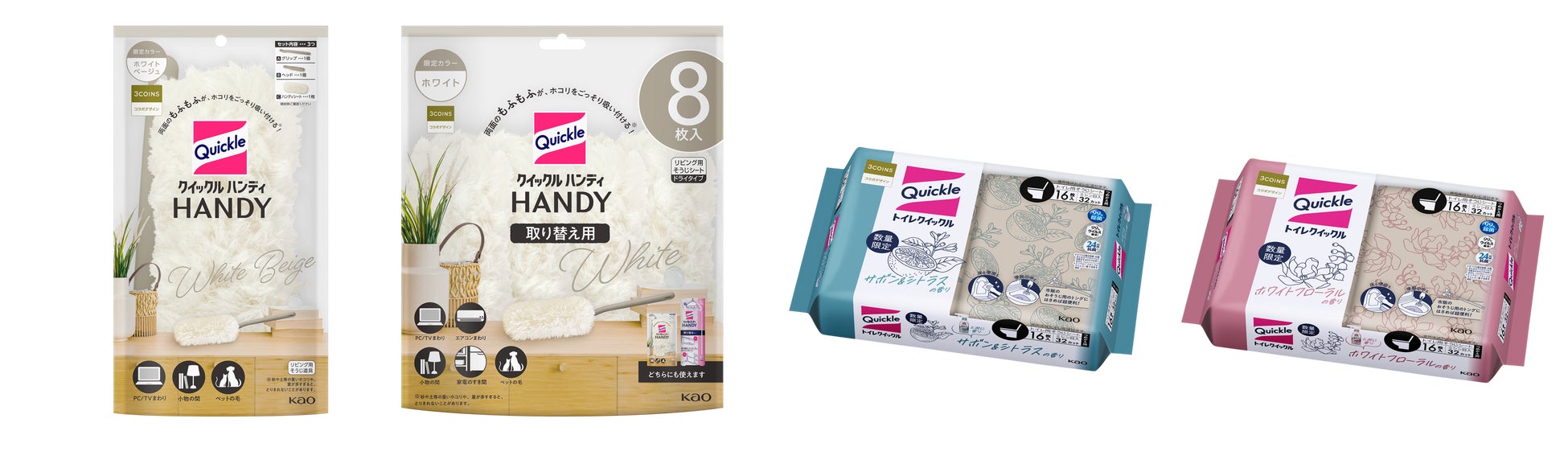 花王株式会社の「クイックル」は、「3COINS」とコラボレーションした『クイックルハンディ』と『トイレクイックル』のデザイン品を「3COINS」にて2025年10月20日より数量限定で発売いたします。また、全国のドラックストア、ホームセンター、スーパーマーケットでも、2025年11月1日より発売いたします。「クイックル」と「3COINS」は、暮らしになじむおそうじアイテムで、おそうじをより気軽に行えるよう提案してまいります。