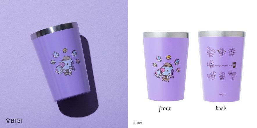「BT21 BABY」たちがとってもキュートなカフェ店員に扮して、コーヒーやスイーツを作ったり運んだりつまみ食いしたり(!?)しているファミリーマート限定デザインのタンブラー。キャラクターが1体ずつデザインされた7種類と、みんなでVAN形のホットケーキを食べているデザインの、計8種のカラフルで可愛いタンブラーです。