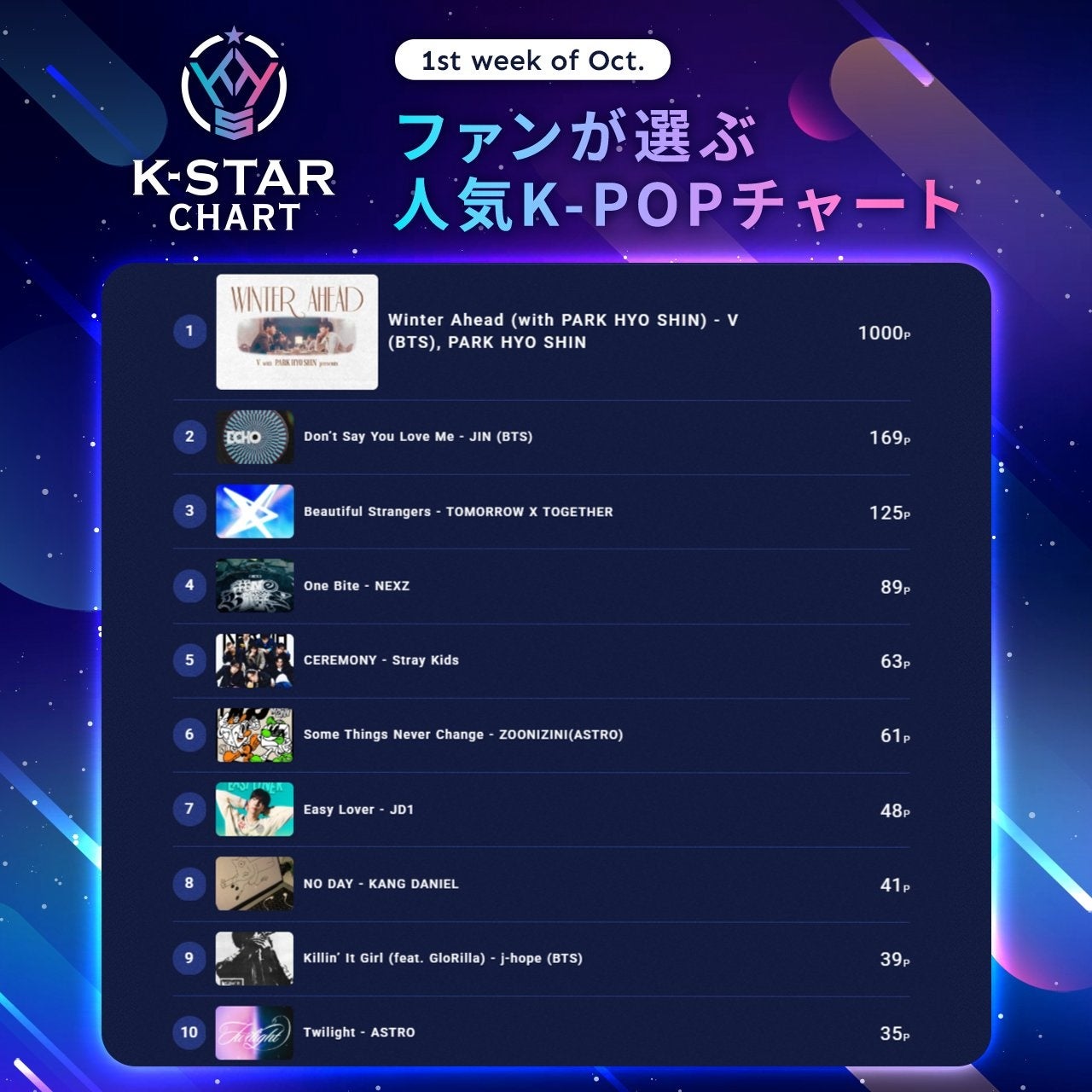 『K-STAR CHART presents POP-K TOP10 Friday』週間チャート1位は、BTSのVとパク・ヒョシンによる「Winter Ahead (with PARK HYO SHIN)」となり、番組内でもオンエアされました。