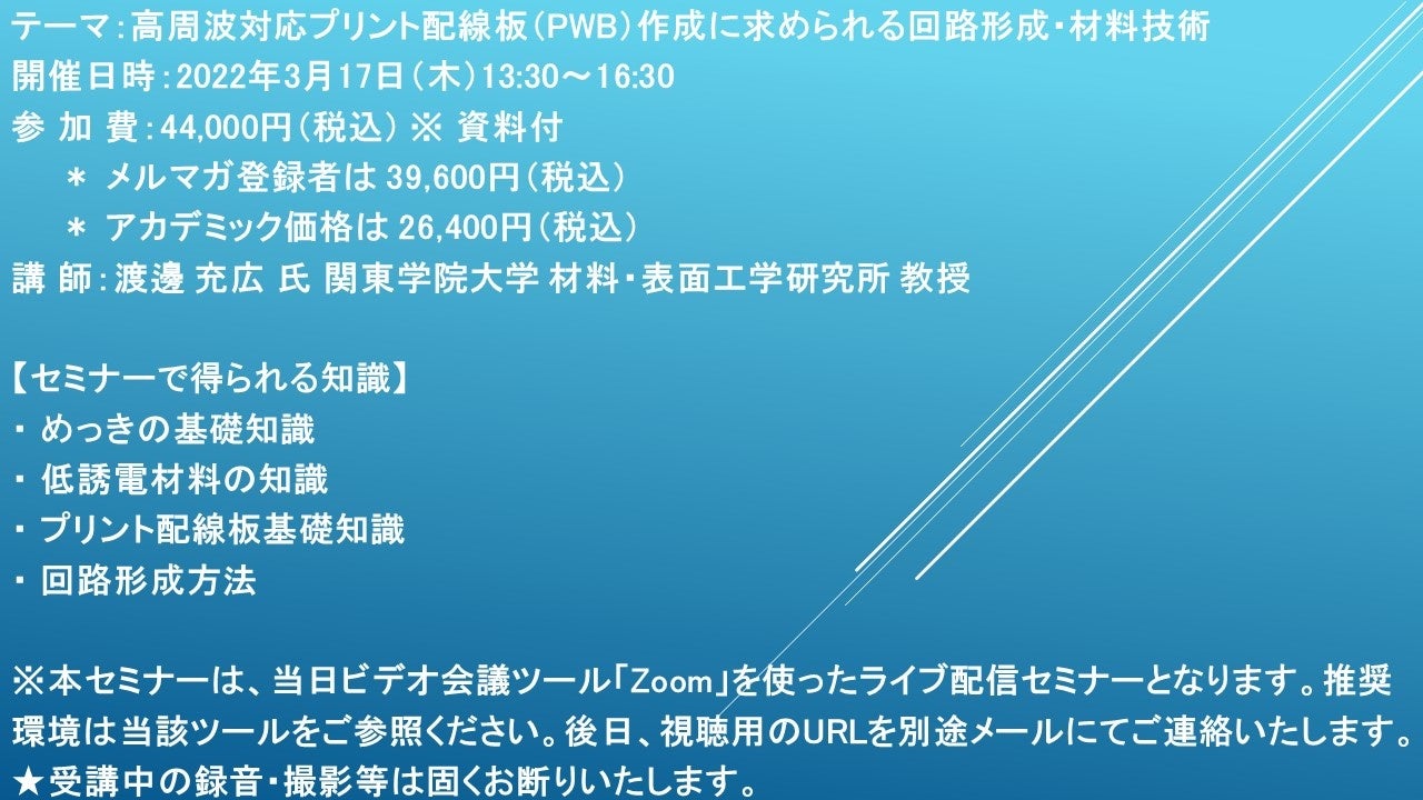 先端技術情報や市場情報を提供している(株)シーエムシー・リサーチ(千代田区神田錦町: https://cmcre.com/ )では、 各種材料・化学品などの市場動向・技術動向のセミナーや書籍発行を行っておりますが、 このたび「高周波対応プリント配線板(PWB)作成に求められる回路形成・材料技術」と題するセミナーを、 講師に渡邊 充広 氏 関東学院大学 材料・表面工学研究所 教授)をお迎えし、2022年3月17日(木)13:30より、 ZOOMを利用したライブ配信で開催いたします。 受講料は、 一般:44,000円(税込)、 弊社メルマガ会員:39,600円(税込)、 アカデミック価格は26,400円(税込)となっております(資料付)。
