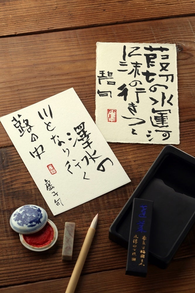 季節の挨拶状を俳句で飾れば、より印象的な一枚になる。はがきに書かれた俳句は、右が河東碧梧桐(かわひがしへきごとう)の句〈葭切(よしきり)の水運河に沫(あわ)の行きつゝ〉。左が高浜虚子の句〈澤水の川となり行く蕗(ふき)の中〉。右下から硯、墨、小筆、雅印、印泥。