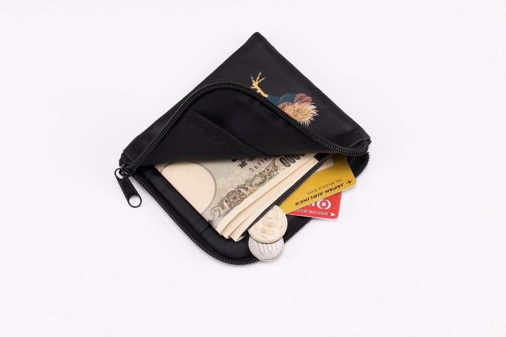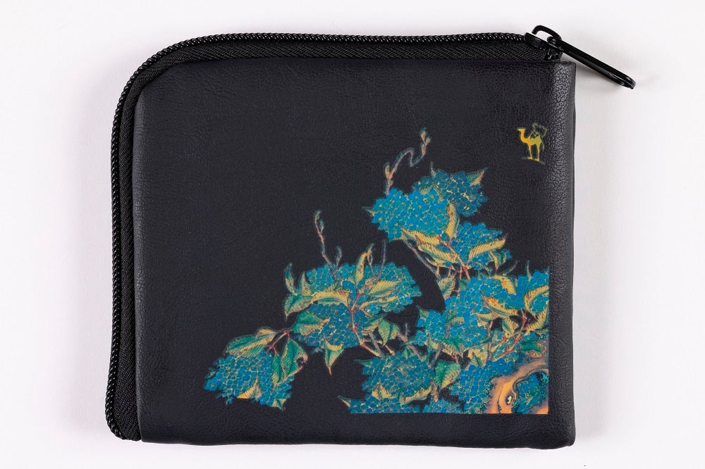 「奇想の画家」にとどまらず、いまや日本美術を代表する江戸時代の画家・伊藤若冲。その名作『紫陽花双鶏図(あじさいそうけいず)』(エツコ&ジョー・プライスコレクション蔵)を表裏にあしらい、軽量な財布に仕立てました。中には札入れ、小銭入れ、カード入れを備えています。散歩や、旅行時のサブ財布としてご活用ください。