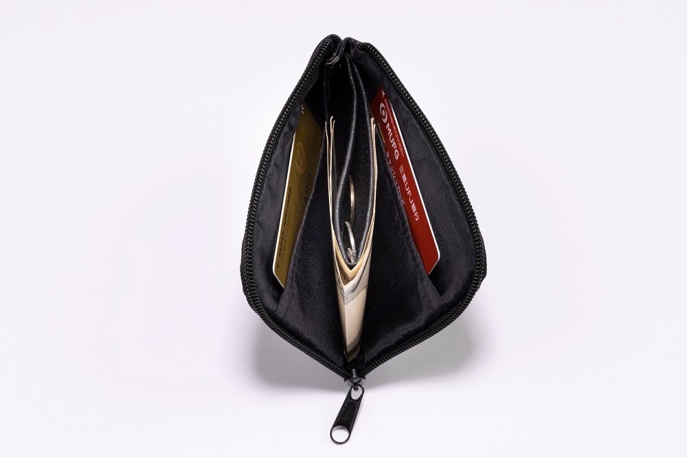中央は小銭入れ。札は小銭入れに巻くようにして収納する。両側にはカード入れ。札もカードも複数枚入れることができる。