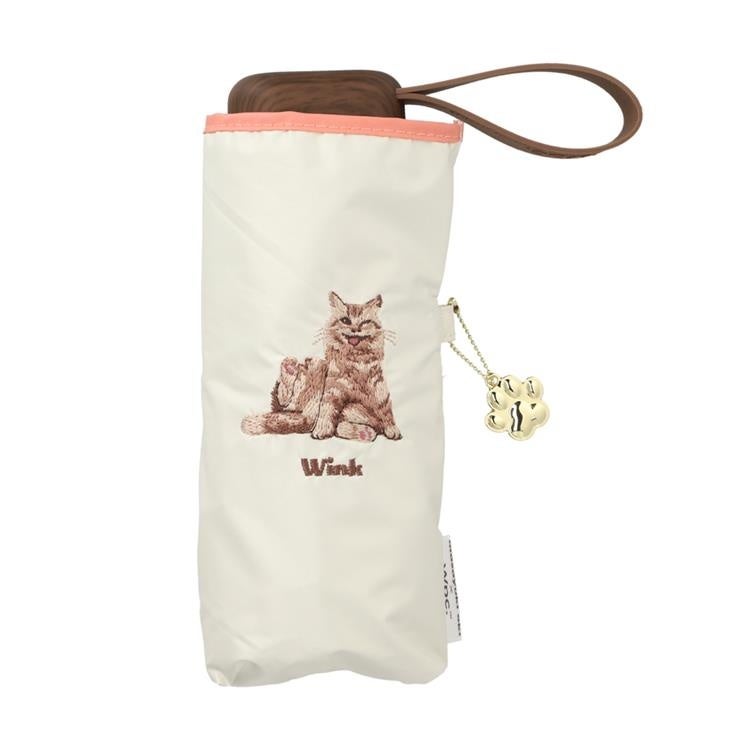 猫写真家・沖 昌之さんが撮影した猫たちを、傘本体と収納袋に刺繍している折りたたみ傘。