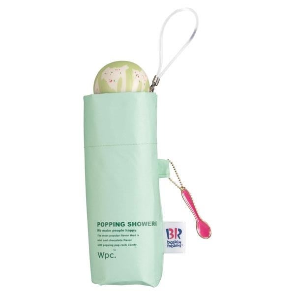 持ち手やワンポイントの刺繍にサーティワン アイスクリームの人気フレーバーを表現した折りたたみ傘。スプーン型チャーム付き。