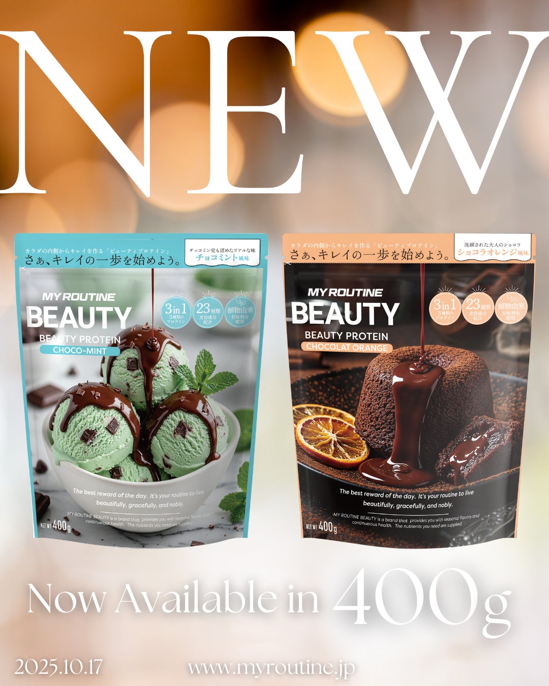 プロテインやスポーツサプリメントなど、革新的な商品を展開し、健康食品事業を強化している株式会社ウエニ貿易(本社:東京都台東区、代表取締役社長:宮上光喜)は、美容と健康をサポートするビューティプロテイン「MY ROUTINE BEAUTY」シリーズより、容量を250gから400gへアップし、パッケージデザインを刷新した新商品を2025年10月13日(水)に全国のドラッグストア・GMSなど約2,500店舗(一部店舗除く)以上で発売いたします。これまでECを中心に販売していた人気シリーズが、全国でのオフライン展開を本格スタート。“美容も健康も、プロテインで叶える”をコンセプトに、継続しやすさと上質感を両立した新しい“キレイ習慣”を提案します。