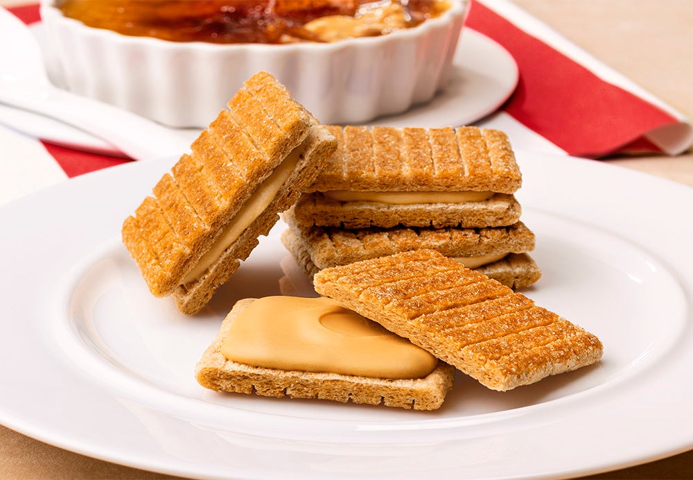 国産生乳のキャラメルパウダーを生地にもショコラにも!パリッと香ばしくブリュレしたバターキャラメル生地で、キャラメル香るショコラをサンドしました。サクッと頬張れば、“キャラメルクレームブリュレ”の甘くとろける味わいが広がります。