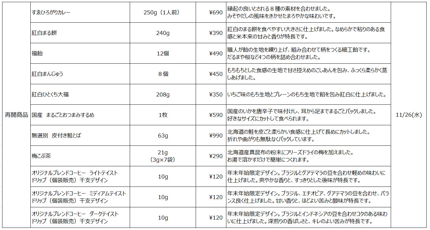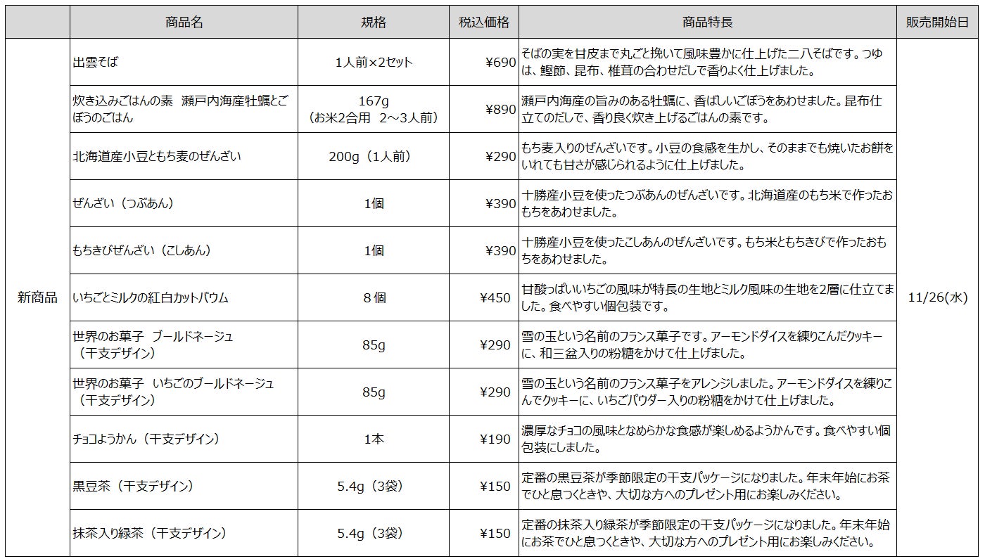今回は、年末年始にぴったりな「出雲そば」や「炊き込みごはんの素 瀬戸内海産牡蠣とごぼうのごはん」、「ぜんざい」、「いちごとミルクの紅白カットバウム」などの新商品や、昨年もご好評いただいた「すゑひろがりカレー」や「福飴」、「紅白まんじゅう」などを発売します。また、ご挨拶やギフトにも使える2026年の干支である「馬」デザインのパッケージを使った商品を拡充し、ラインナップを豊富に取り揃えて展開します。
