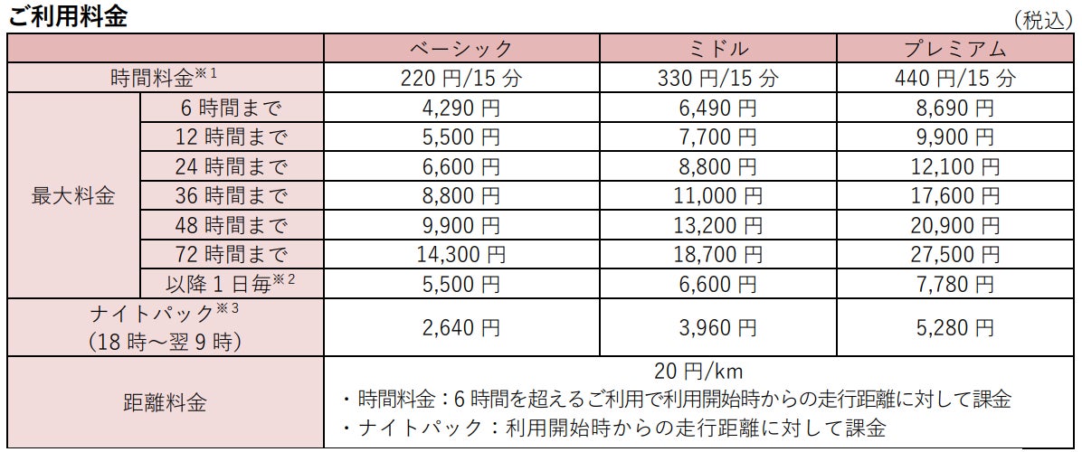 ※1 24時間以上のご予約で、実際のご利用が2時間未満の場合は、[ミニマムチャージ]がかかります。詳細はこちら
