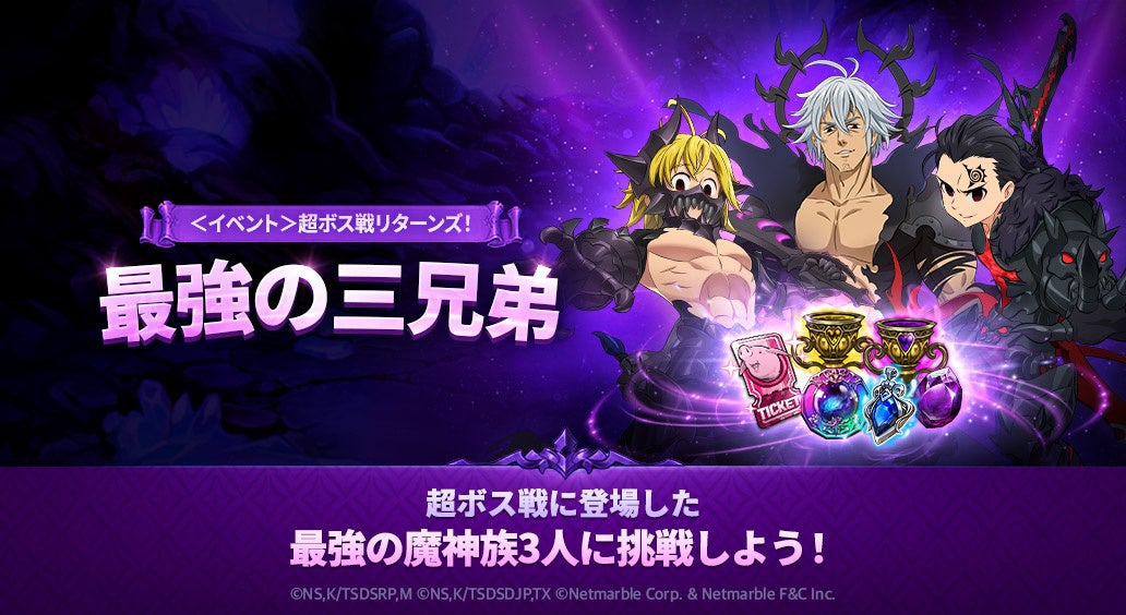 メリオダス、ゼルドリス、エスタロッサの三兄弟が超ボス戦に復刻登場いたします。