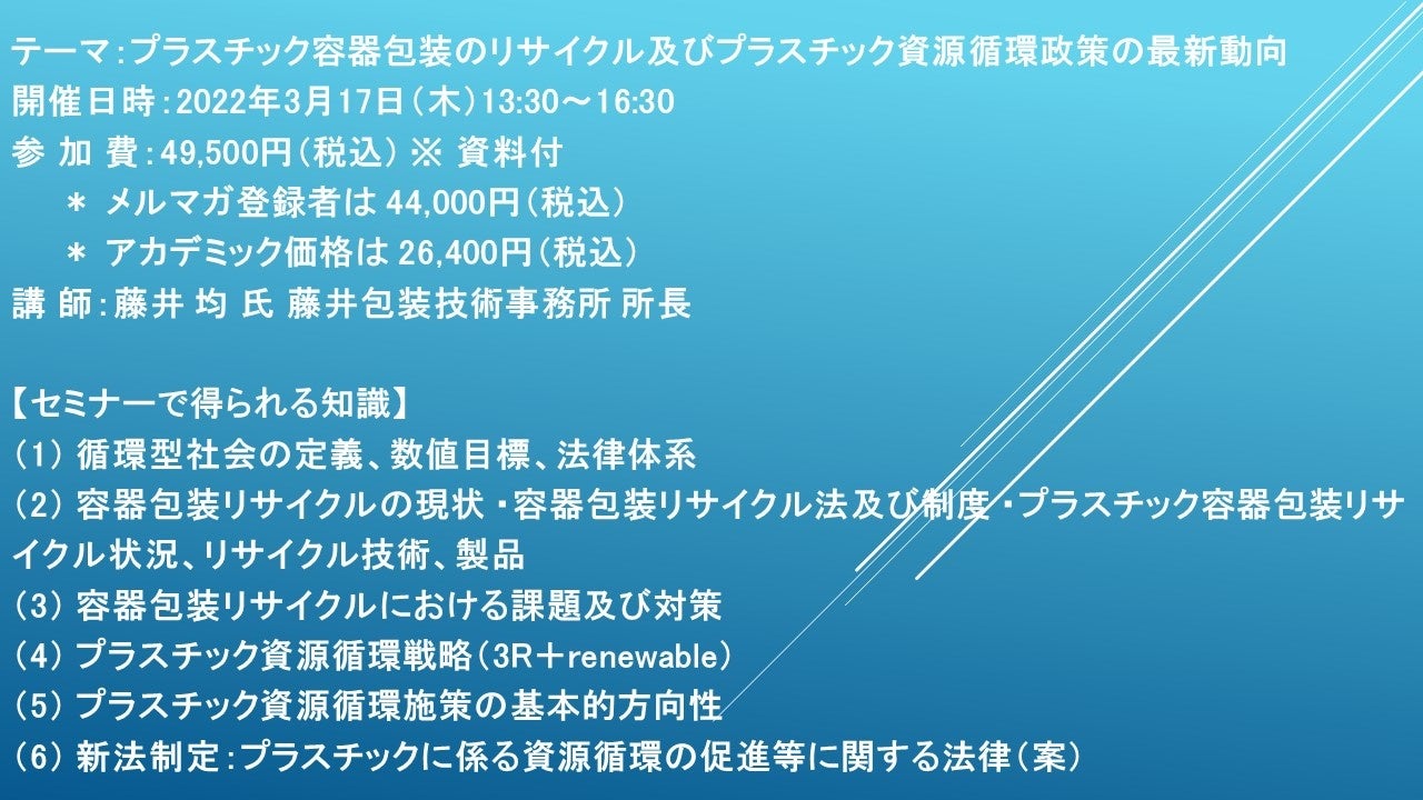 先端技術情報や市場情報を提供している(株)シーエムシー・リサーチ(千代田区神田錦町: https://cmcre.com/ )では、 各種材料・化学品などの市場動向・技術動向のセミナーや書籍発行を行っておりますが、 このたび「プラスチック容器包装のリサイクル及びプラスチック資源循環政策の最新動向」と題するセミナーを、 講師に藤井 均 氏 藤井包装技術事務所 所長)をお迎えし、2022年3月17日(木)13:30より、 ZOOMを利用したライブ配信で開催いたします。 受講料は、 一般:49,500円(税込)、 弊社メルマガ会員:44,000円(税込)、 アカデミック価格は26,400円(税込)となっております(資料付)。