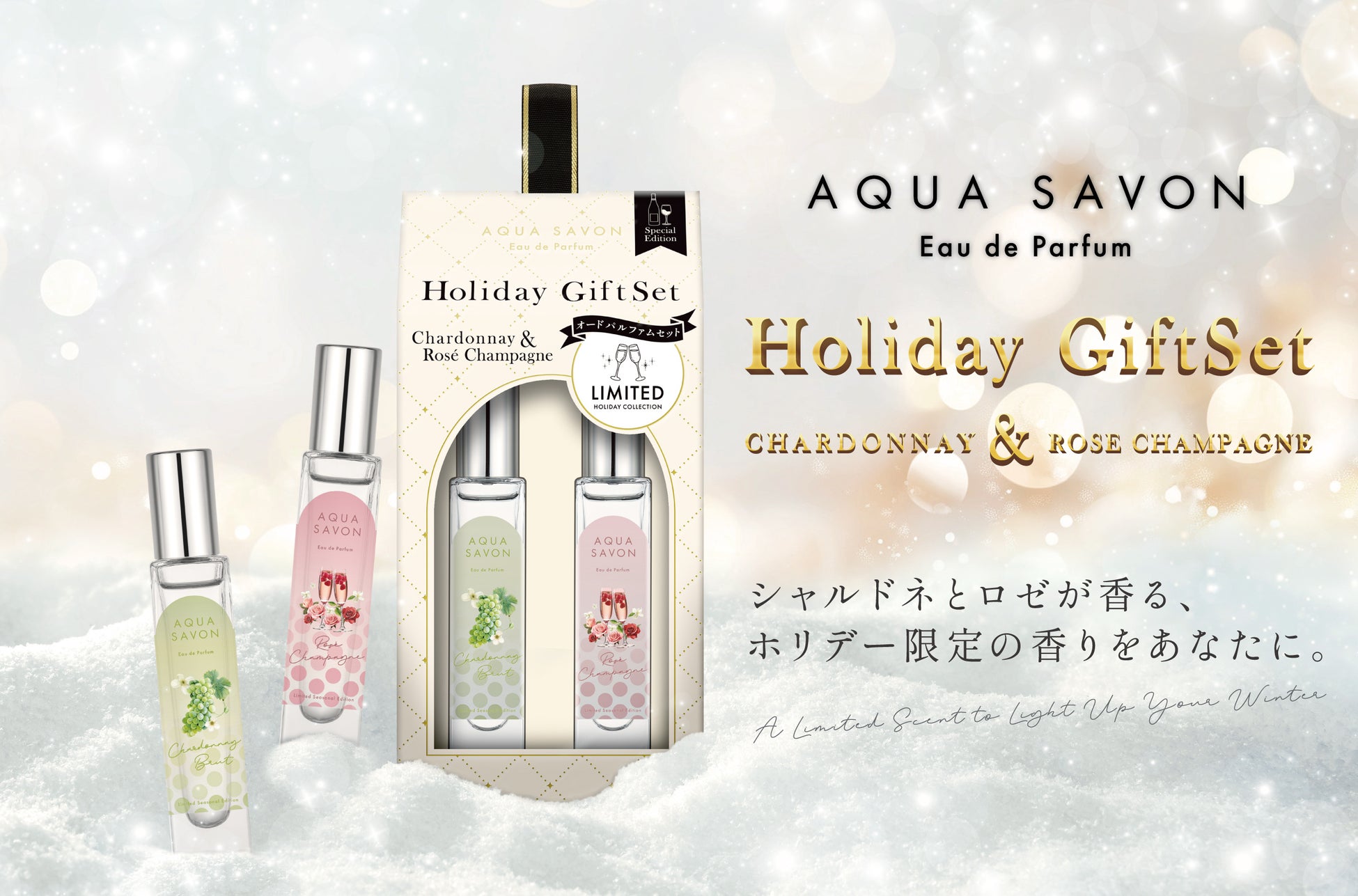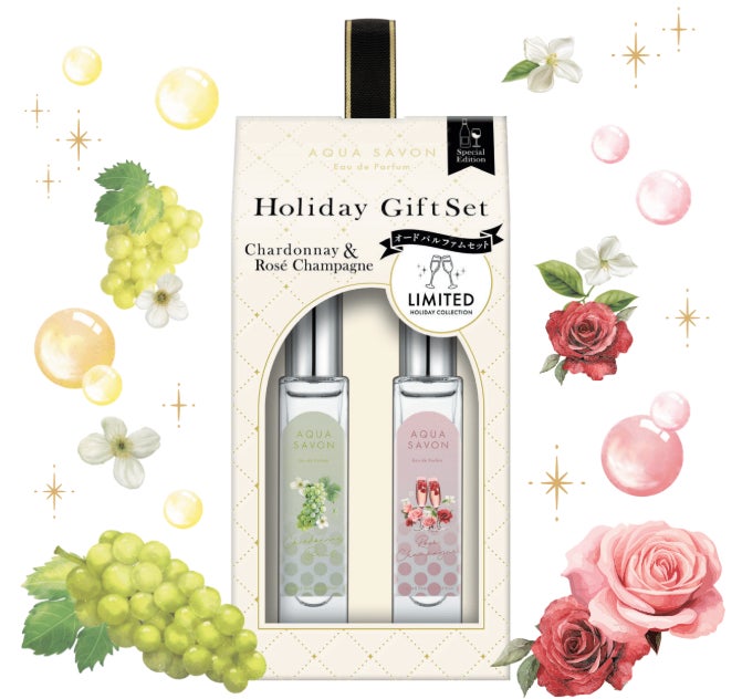 累計出荷本数960万本突破!(※1)限定のフレグランスコフレとして『アクア シャボン』から、〈シャルドネブリュットの香り〉×〈ロゼシャンパンの香り〉のオードパルファム ホリデーギフトセットが新登場。