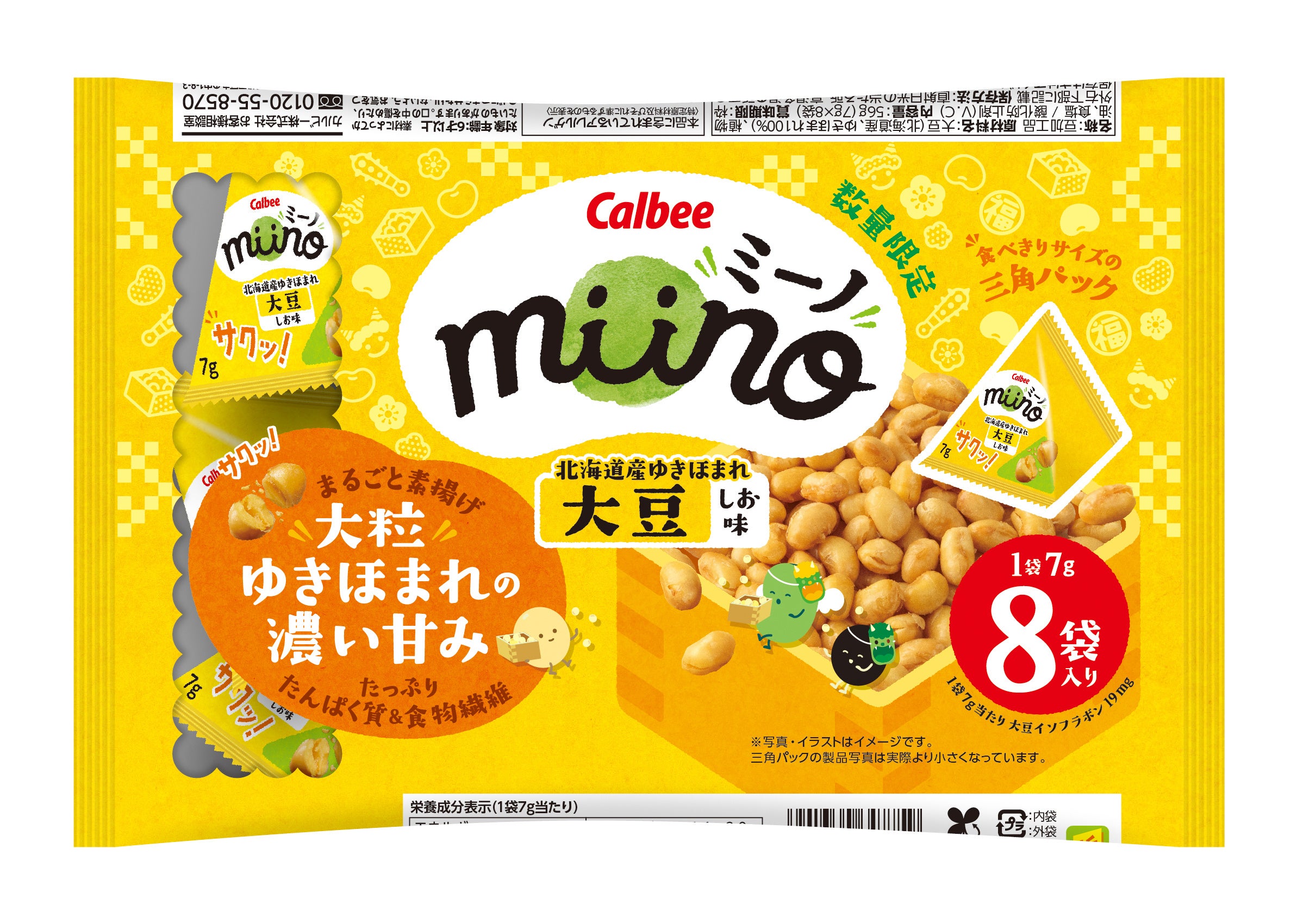 カルビー株式会社(本社:東京都千代田区、代表取締役社長兼CEO:江原 信)は、豆まるごとのおいしさをいつでもどこでも楽しめる「miino(ミーノ)」シリーズより、素揚げした大豆2種類をミックスした新商品『miinoだいずに味わうミックス 黄大豆黒大豆 しお味』を2026年1月12日(月)から、全国のコンビニエンスストア先行で期間限定発売します。コンビニエンスストア以外の店舗では、2026年1月19日(月)から期間限定発売します(2026年5月下旬終売予定)。また、節分に合わせて“北海道産ゆきほまれ”の『miino大豆しお味 三角パック』節分デザインを、2026年1月12日(月)より全国のコンビニエンスストア以外の店舗にて数量限定で発売します。なくなり次第、終了。