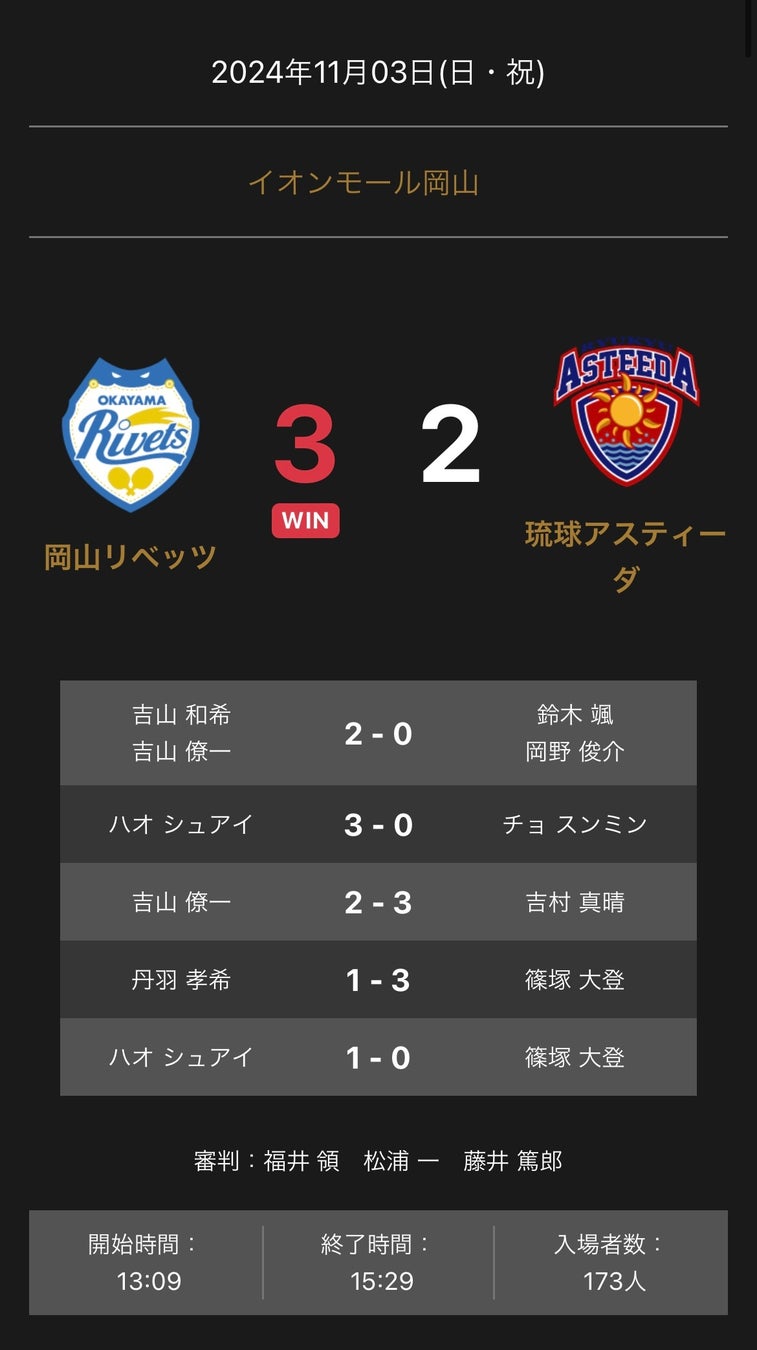 ノジマTリーグ 2024-2025シーズン 公式戦 11月3日開催 「岡山リベッツ vs 琉球アスティーダ」の試合は、3-2で岡山リベッツが勝利しました。