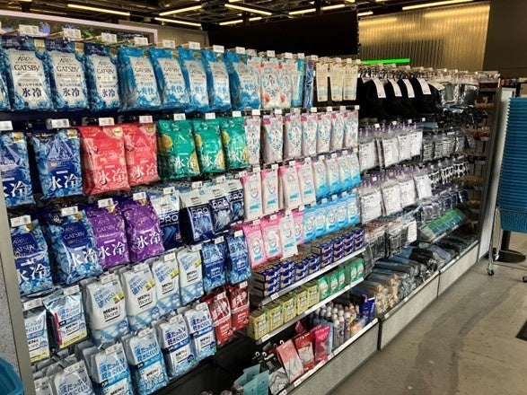 ファミリーマート大阪・関西万博店では、ご来場のお客さまに安心して会場内を楽しんでいただけるよう、熱中症対策に役立つ商品の売場を拡大し、多彩な商品ラインアップを取り揃えております。