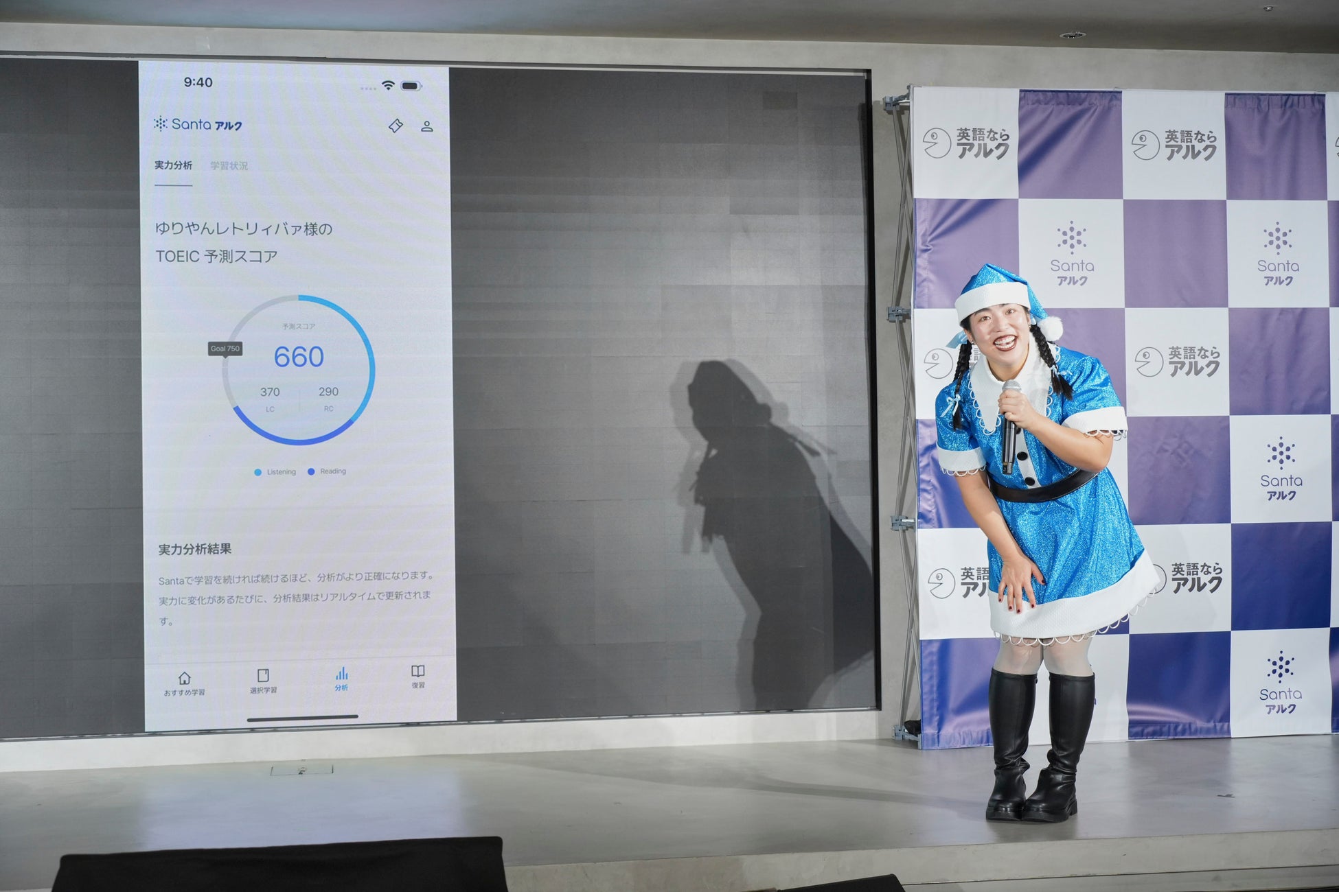 最後に、ゆりやんさんの特技であるラップで「Santaアルク」を表現する特別企画が実施されました。MCの合図とともに音楽がスタートすると、ゆりやんさんが「Santaアルク」をテーマにオリジナルラップを披露。アプリの機能や学習者の気持ちを表現したリズミカルなパフォーマンスで、会場は最高潮の盛り上がりとなりました。