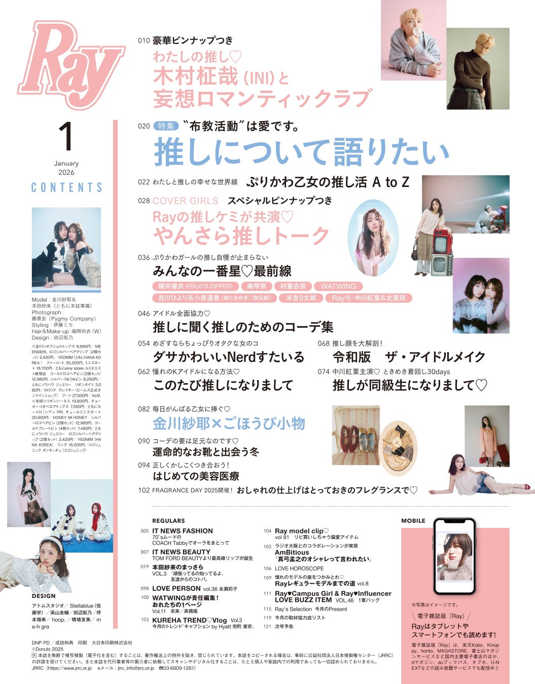2025年11月21日(金)に発売する『Ray』2026年1月号の通常版表紙は金川紗耶(乃木坂46)&本田紗来、特別版表紙は木村柾哉さん(INI)がそれぞれ務めます。今号の大特集テーマは「“布教活動”は愛です。推しについて語りたい」。みんなの推し活事情やコーデ&メイク術、さらにはKアイドルになる方法など推し活にまつわる情報を、最新のファッション情報とあわせてたっぷりとお届けします。