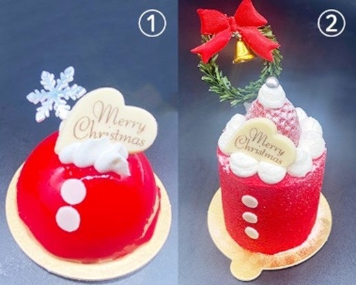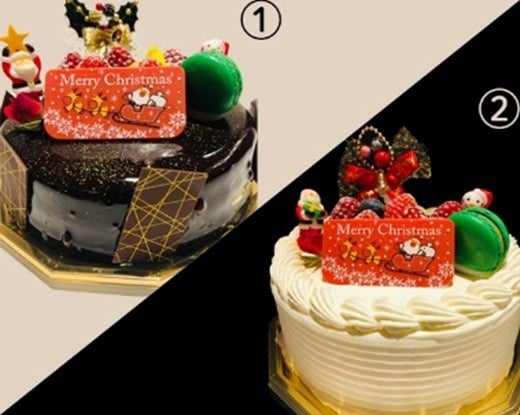 ①濃厚なチョコレートケーキにマカロン、かわいい飾りをのせたクリスマス特別バージョンケーキ。②作りたてのとろける生クリームをふんだんに使用したクリスマス特別バージョンの生ショートケーキ。