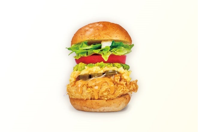 「メキシカンエッグチキンバーガー」は、たまごフィリングのマイルドな味わいに、アボカドガカモレとハラペーニョの辛さをアクセントに加えた一品。ピリッとした辛さをたまごがやさしく包み込み、コブドレソースをかけたチキンと一緒に挟むことでバランスの取れた味わいに仕上げました。