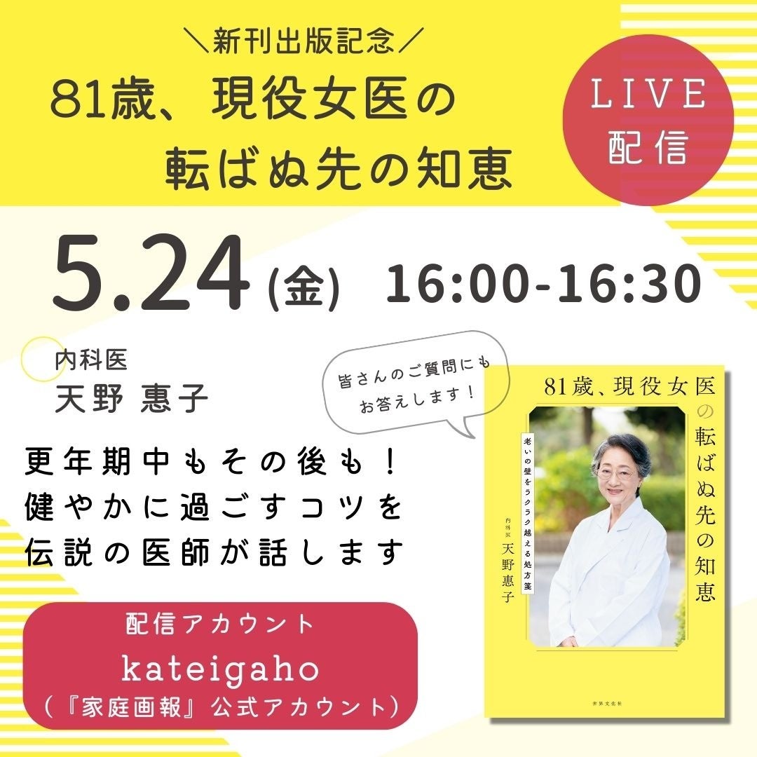 伝説の医師・天野惠子さんによる『81歳、現役女医の転ばぬ先の知恵』出版記念インスタライブを、5月24日(金)配信決定‼