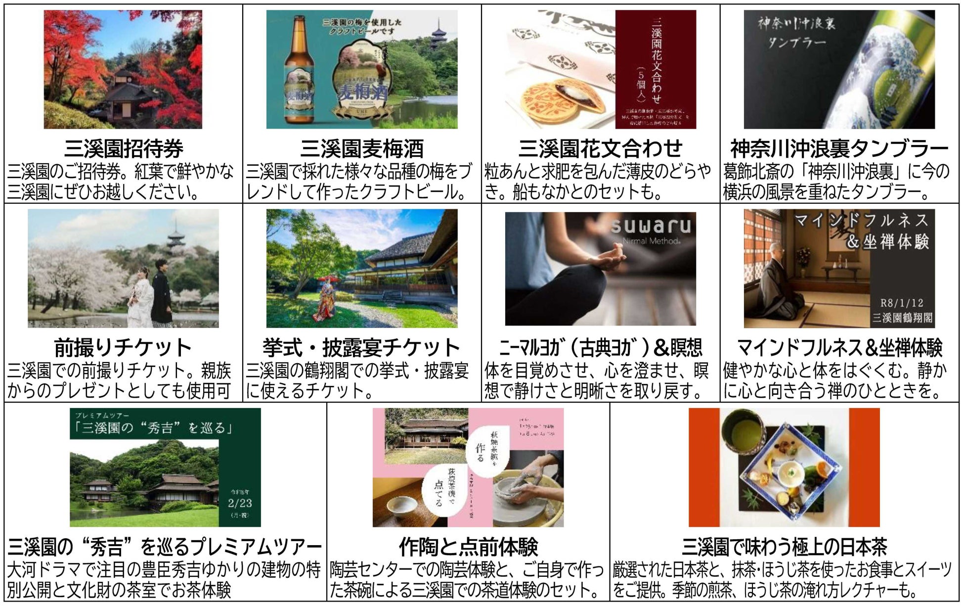 寄附のお礼として、三溪園でのお食事体験や文化体験、三溪園グッズなど、多種多様な返礼品をご用意しました。