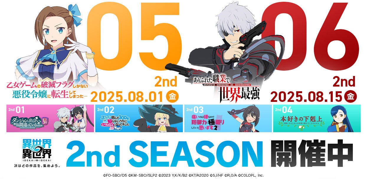 『異世界∞異世界』はスマートフォン&PCでもっと異世界を楽しむゲームです。様々な人気アニメ作品が次々に登場することで、好きなキャラクターを集めたり、眺めたりして、マイペースに”異世活”をお楽しみいただけます。本作品の「2ndシーズン」が、2025年6月1日(日)より開幕しており、人気アニメ6作品が順次登場いたします。この度、5作品目として8月1日(金)より「乙女ゲームの破滅フラグしかない悪役令嬢に転生してしまった…」、6作品目として8月15日(金)より「ありふれた職業で世界最強」の登場が決定いたしました。