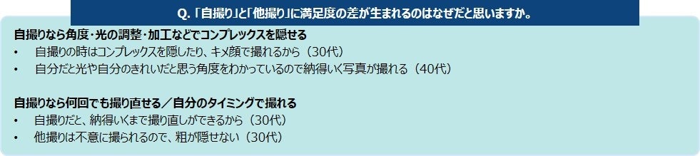 また、「自撮り」の方が満足できる理由として多く挙げられたのは、「自撮りなら角度・光の調整・加工などでコンプレックスを隠せる」といった主旨の回答や、「自撮りなら撮り直しやタイミングの自由が利く」といった主旨の回答でした。